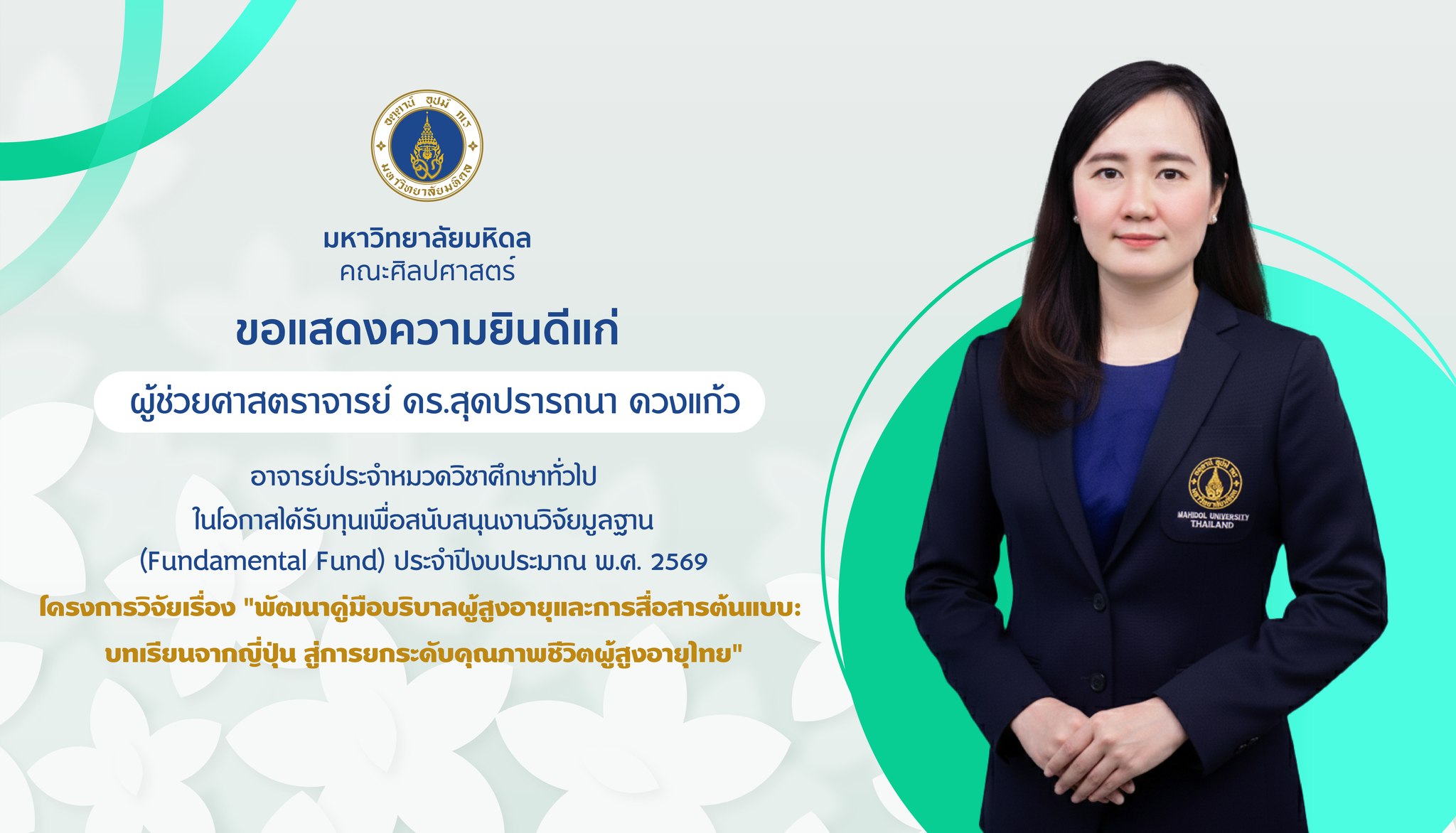 คณะศิลปศาสตร์ ขอแสดงความยินดีแก่ ผู้ช่วยศาสตราจารย์ ดร.สุดปรารถนา ดวงแก้ว อาจารย์ประจำหมวดวิชาศึกษาทั่วไป ในโอกาสได้รับทุนเพื่อสนับสนุนงานวิจัยมูลฐาน (Fundamental Fund) ประจำปีงบประมาณ พ.ศ. 2569 โครงการวิจัยเรื่อง “พัฒนาคู่มือบริบาลผู้สูงอายุและการสื่อสารต้นแบบ: บทเรียนจากญี่ปุ่น สู่การยกระดับคุณภาพชีวิตผู้สูงอายุไทย”