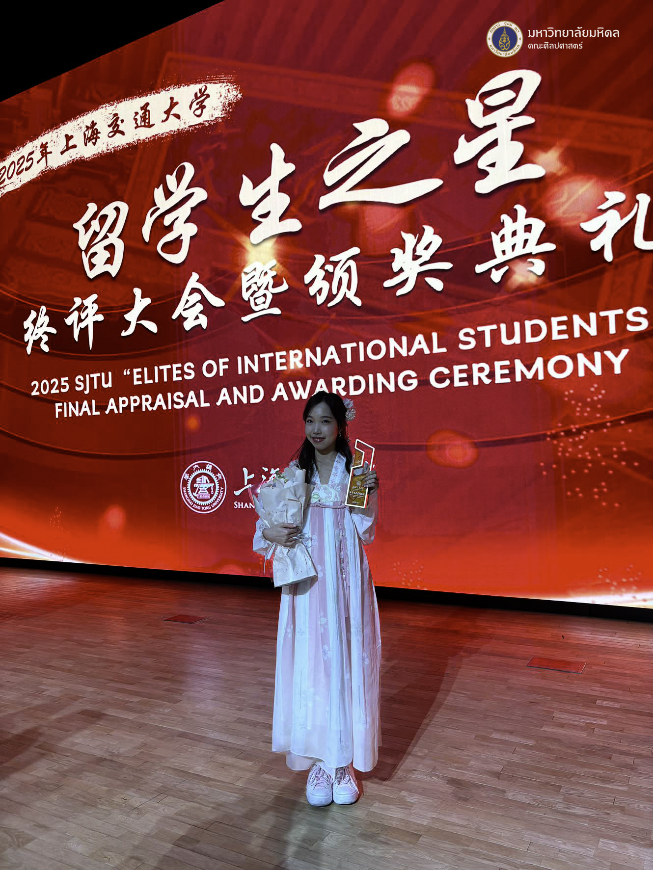คณะศิลปศาสตร์ ขอแสดงความยินดีแก่ นางสาวปันนา ล้อเจริญกิจ นักศึกษาหลักสูตรศิลปศาสตรบัณฑิต สาขาวิชาภาษาจีน (หลักสูตรนานาชาติ) ชั้นปีที่ 3 ในโอกาสได้รับรางวัล 留学生之星提名奖 (Elites of International Students Nominee Award) จากการประกวด 2025 年上海交通大学留学生之星 (2025 SJTU “Elites of International Students”) จัดการประกวดโดย Shanghai Jiao Tong University
