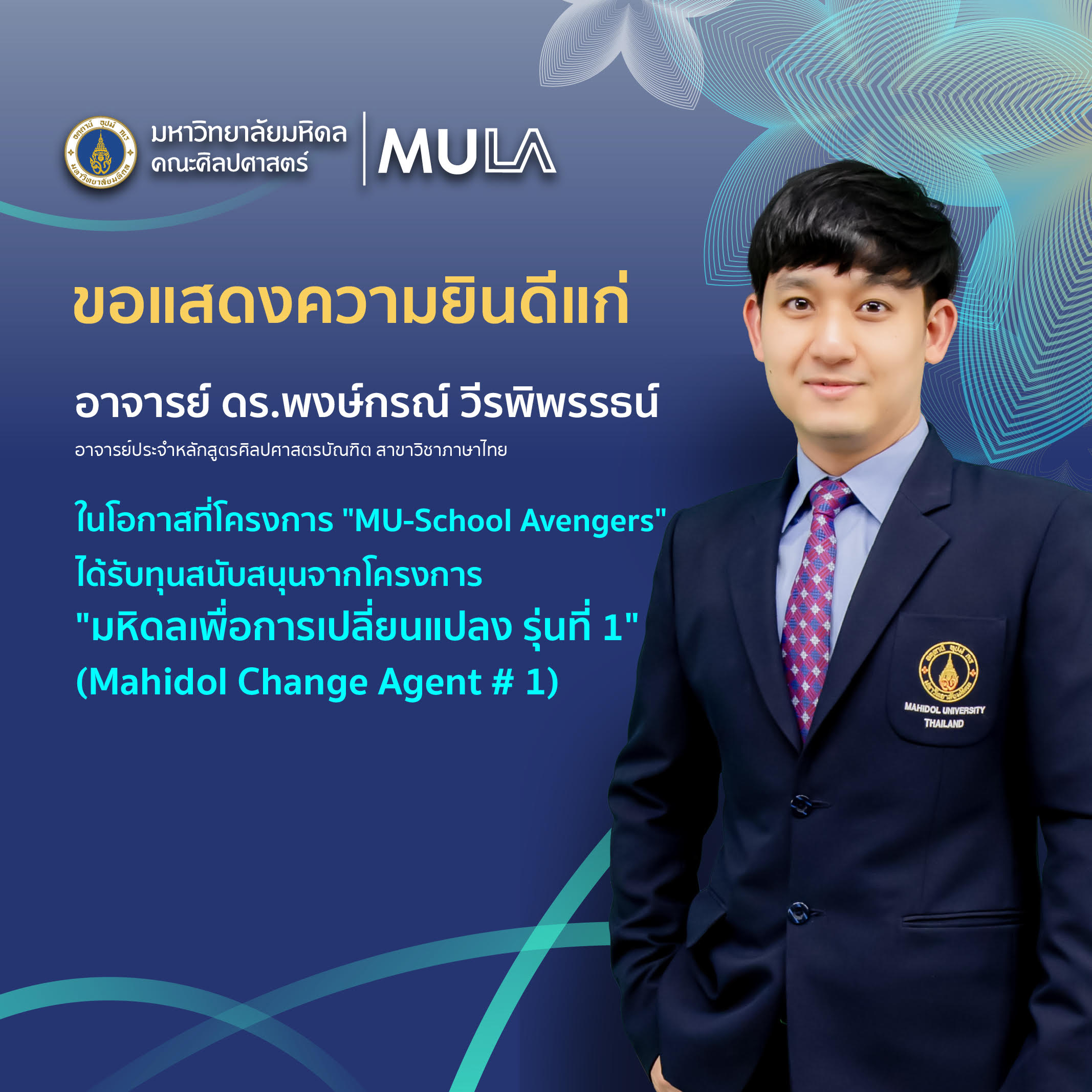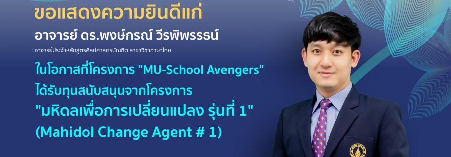 ผลงานและรางวัล ผลงานและรางวัลปี2568 26/11/2025 admin คณะศิลปศาสตร์ ขอแสดงความยินดีแก่ อาจารย์ ดร.พงษ์กรณ์ วีรพิพรรธน์ อาจารย์ประจำหลักสูตรศิลปศาสตรบัณฑิต สาขาวิชาภาษาไทยในโอกาสที่โครงการ “MU-School Avengers”ได้รับทุนสนับสนุนจากโครงการ “มหิดลเพื่อการเปลี่ยนแปลง รุ่นที่ 1”(Mahidol Change Agent #1) จัดโดยงานบริการวิชาการและพันธกิจสัมพันธ์กับสังคม กองแผนงาน มหาวิทยาลัยมหิดล