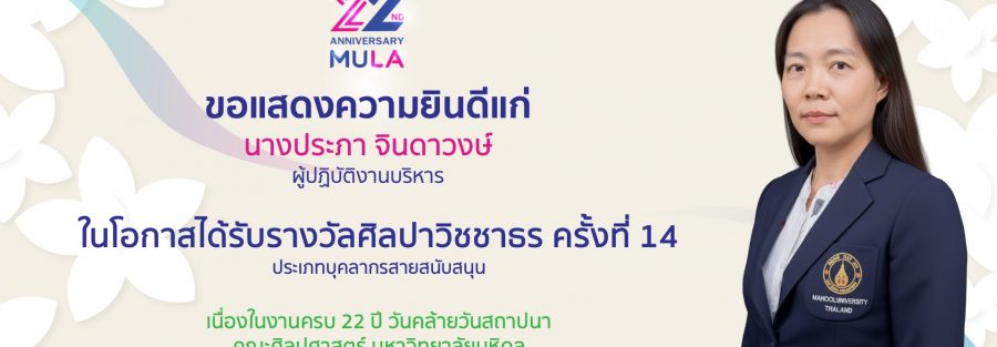 คณะศิลปศาสตร์ ขอแสดงความยินดีแก่ นางประภา จินดาวงษ์ ผู้ปฏิบัติงานบริหาร ในโอกาสได้รับรางวัลศิลปาวิชชาธร ครั้งที่ 14 ประเภทบุคลากรสายสนับสนุน เนื่องในงานครบ 22 ปี วันคล้ายวันสถาปนาคณะศิลปศาสตร์ มหาวิทยาลัยมหิดล