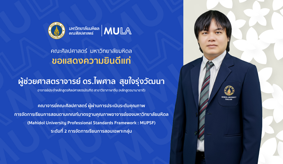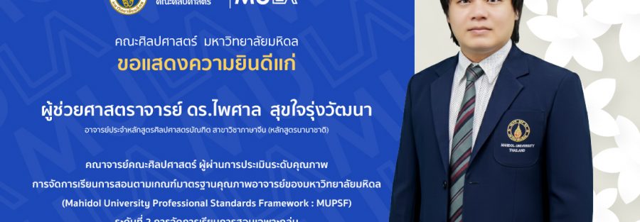 คณะศิลปศาสตร์ ขอแสดงความยินดีแก่ ผู้ช่วยศาสตราจารย์ ดร.ไพศาล สุขใจรุ่งวัฒนา อาจารย์ประจำหลักสูตรศิลปศาสตรบัณฑิต สาขาวิชาภาษาจีน (หลักสูตรนานาชาติ) คณาจารย์คณะศิลปศาสตร์ ผู้ผ่านการประเมินระดับคุณภาพการจัดการเรียนการสอนตามเกณฑ์มาตรฐานคุณภาพอาจารย์ของมหาวิทยาลัยมหิดล (Mahidol University Professional Standards Framework : MUPSF) ระดับที่ 2 การจัดการเรียนการสอนเฉพาะกลุ่ม