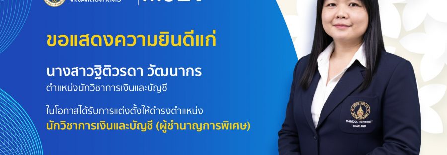 คณะศิลปศาสตร์ ขอแสดงความยินดีแก่ นางสาวฐิติวรดา วัฒนากร ตำแหน่งนักวิชาการเงินและบัญชี ในโอกาสได้รับการแต่งตั้งให้ดำรงตำแหน่ง นักวิชาการเงินและบัญชี (ผู้ชำนาญการพิเศษ)