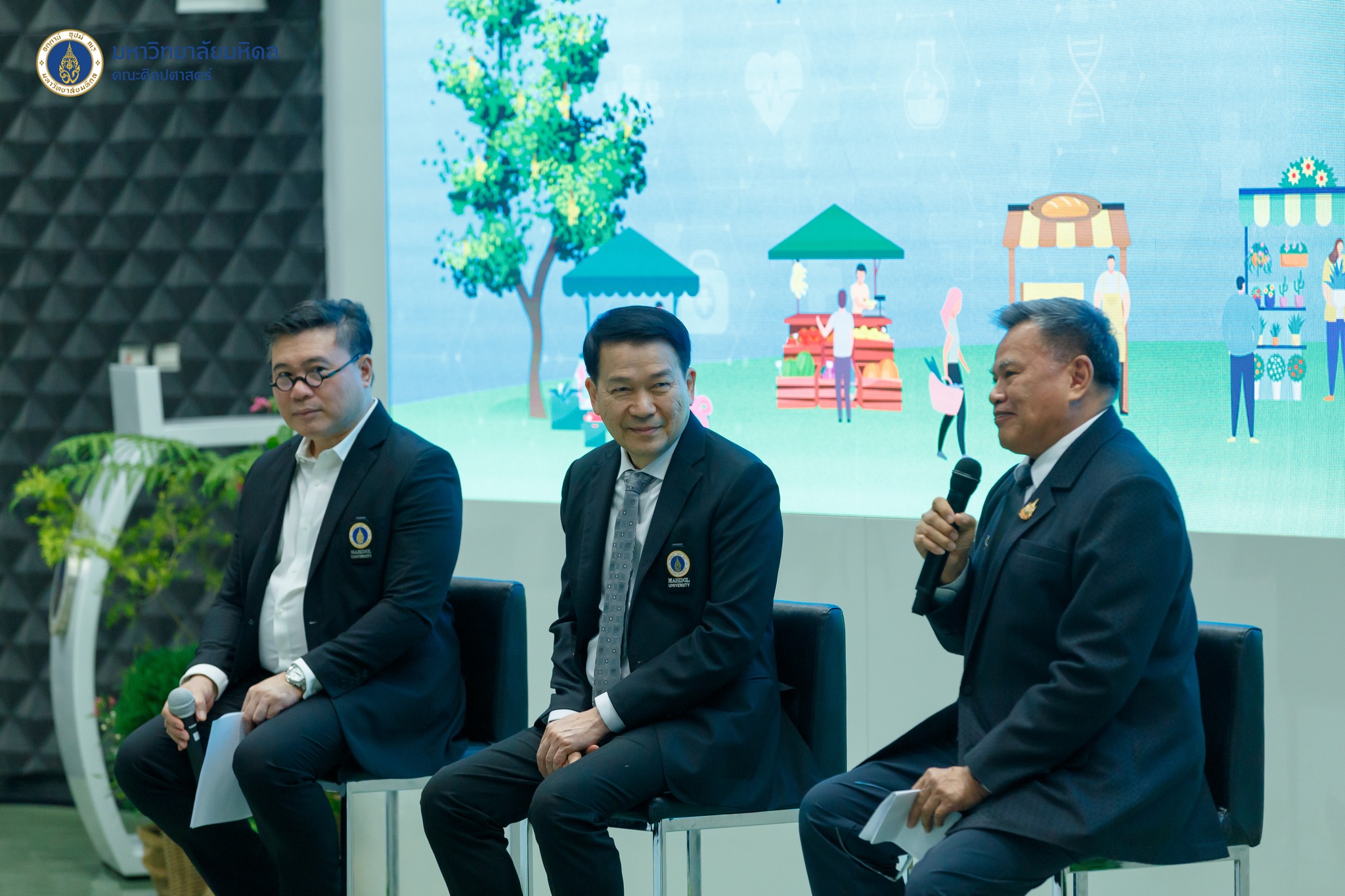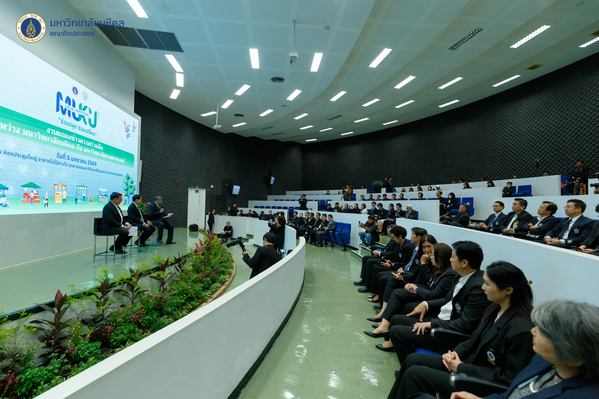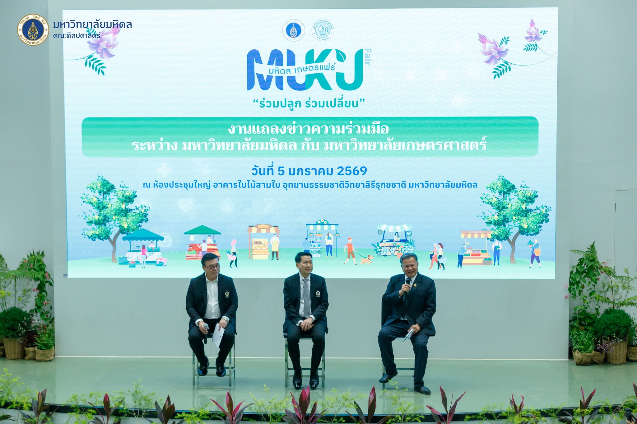 ข่าว ประจำปี 2569 05/01/2026 admin วันที่ 5 มกราคม 2569 ผู้ช่วยศาสตราจารย์ ดร.อภิวิชญ์ เลี้ยงอิสสระ คณบดีคณะศิลปศาสตร์ เข้าร่วมงานแถลงข่าวความร่วมมือระหว่างมหาวิทยาลัยมหิดล และมหาวิทยาลัยเกษตรศาสตร์ ในการจัดงาน “มหิดล เกษตรแฟร์ 2569” ภายใต้แนวคิด “ร่วมปลูก ร่วมเปลี่ยน” ณ ห้องประชุมใหญ่ อาคารใบไม้สามใบ อุทยานธรรมชาติวิทยาสิรีรุกขชาติ มหาวิทยาลัยมหิดล ศาลายา โดยภายในงานได้รับเกียรติจากศาสตราจารย์ นายแพทย์ปิยะมิตร ศรีธรา อธิการบดีมหาวิทยาลัยมหิดล ดร.ดำรงค์ ศรีพระราม อธิการบดีมหาวิทยาลัยเกษตรศาสตร์ และรองศาสตราจารย์ ดร.สิทธิวัฒน์ เลิศศิริ รองอธิการบดีมหาวิทยาลัยมหิดล ร่วมแถลงวัตถุประสงค์และแนวทางความร่วมมือการจัดงานในครั้งนี้มีเป้าหมายหลักเพื่อผสานความเชี่ยวชาญของสองมหาวิทยาลัยชั้นนำ ระหว่างองค์ความรู้ด้านเกษตร นวัตกรรม และสุขภาพ เพื่อสร้างแรงบันดาลใจในการเปลี่ยนแปลงสังคมสู่ความยั่งยืน โดยมุ่งเน้นการบูรณาการความรู้ด้านนวัตกรรม เกษตรปลอดภัย และสุขภาพแบบองค์รวมเข้าด้วยกัน มีกำหนดจัดงานขึ้นระหว่างวันที่ 14–18 มกราคม 2569 ณ มหาวิทยาลัยมหิดล วิทยาเขตศาลายา