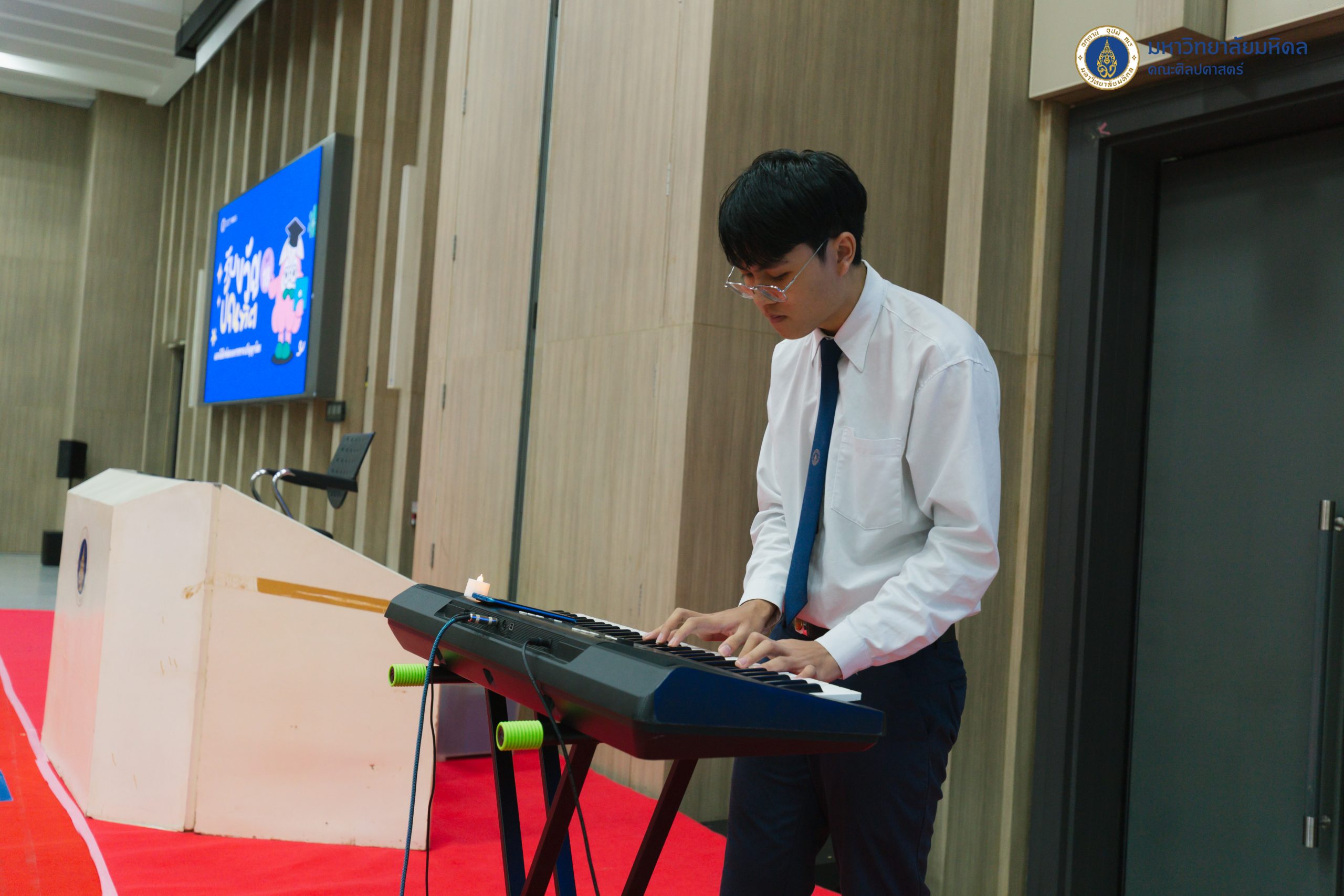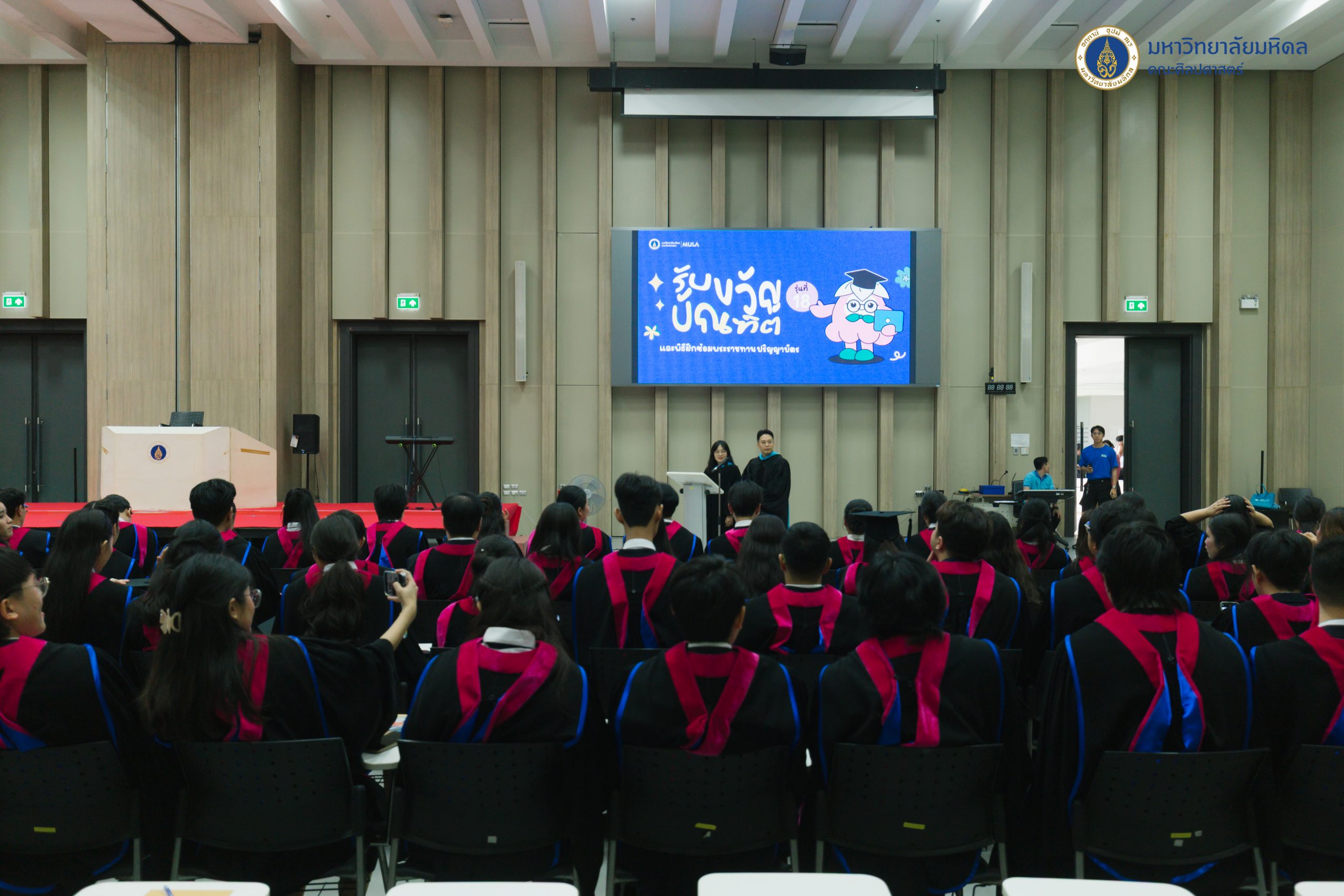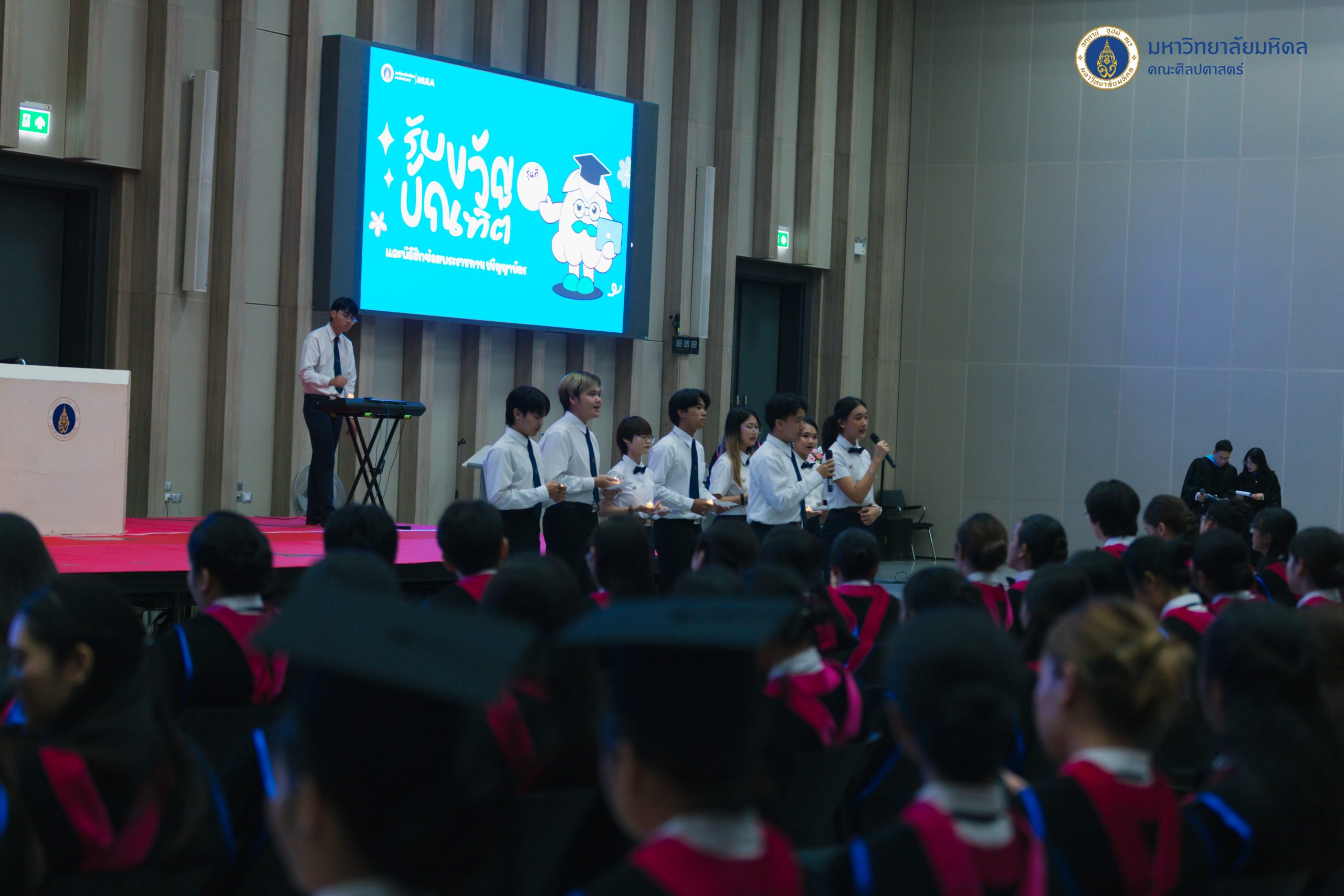 วันที่ 3 ตุลาคม 2568 คณะศิลปศาสตร์ จัดงานรับขวัญบัณฑิตและพิธีฝึกซ้อมเข้ารับพระราชทานปริญญาบัตร ประจำปีการศึกษา 2567 ณ ห้อง 217 ชั้น 2 อาคารสิริวิทยา คณะศิลปศาสตร์ มหาวิทยาลัยมหิดล ศาลายา โดยช่วงเช้าเป็นกิจกรรมถ่ายภาพหมู่บัณฑิตคณะศิลปศาสตร์ ณ บริเวณชั้น 1 อาคารสิริวิทยา คณะศิลปศาสตร์ มหาวิทยาลัยมหิดล ศาลายา จากนั้นผู้บริหาร คณาจารย์ ร่วมแสดงความยินดี โดยนำบัณฑิตเดินแถวขึ้นบันไดดาว เพื่อเข้าสู่พิธีการ