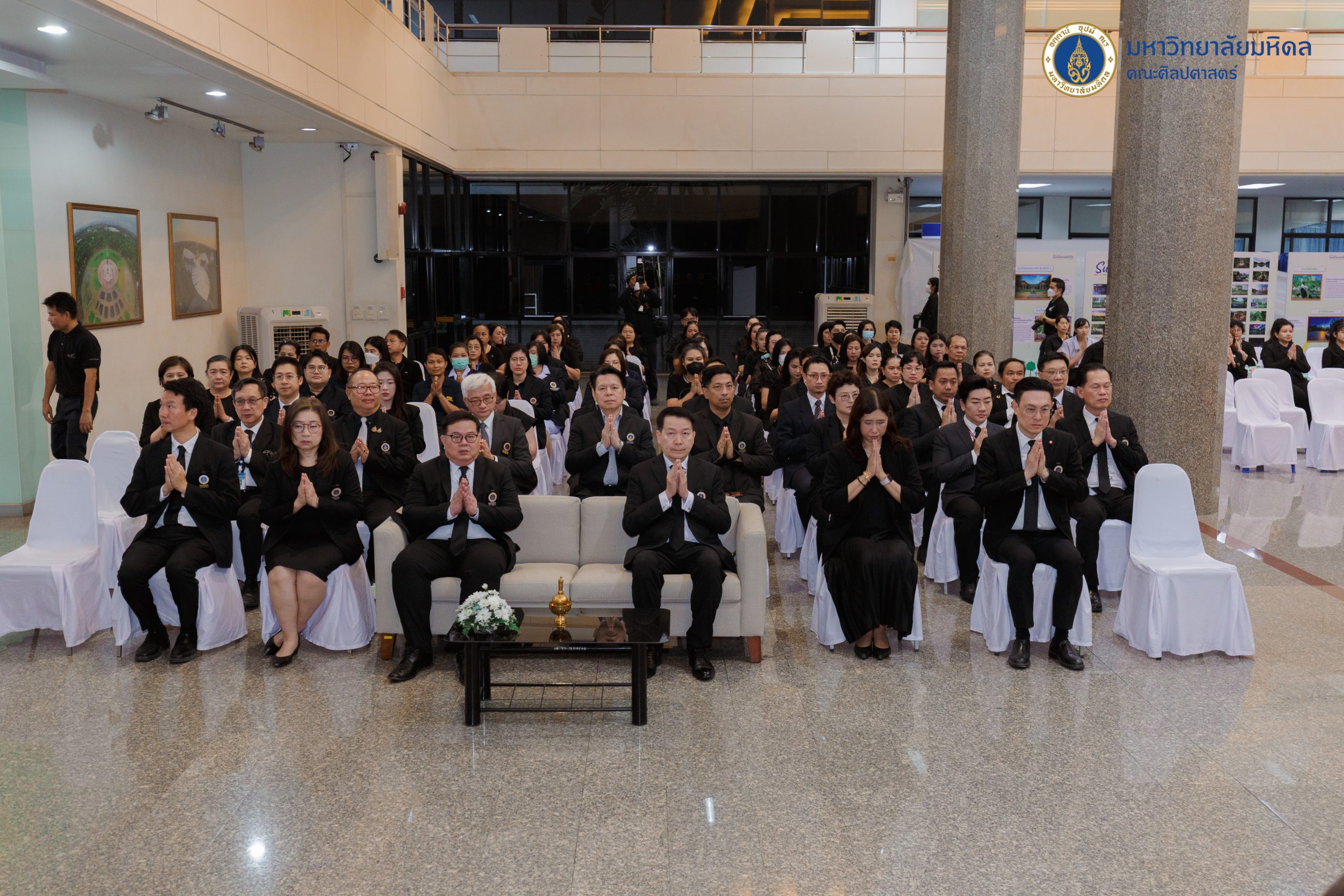 ข่าว ประจำปี 2569 30/01/2026 admin วันที่ 30 มกราคม 2569 คณะศิลปศาสตร์ นำโดยอาจารย์ ดร.ธีระยุทธ สุริยะ ผู้ช่วยคณบดีฝ่ายกิจการนักศึกษา พร้อมด้วยคณาจารย์และเจ้าหน้าที่ เข้าร่วมพิธีบำเพ็ญกุศล 100 วันอุทิศถวายแด่สมเด็จพระนางเจ้าสิริกิติ์ พระบรมราชินีนาถ พระบรมราชชนนีพันปีหลวงโดยมี ศาสตราจารย์ นายแพทย์ปิยะมิตร ศรีธรา อธิการบดีมหาวิทยาลัยมหิดล เป็นประธานในพิธี ณ สำนักงานอธิการบดี มหาวิทยาลัยมหิดล ศาลายา