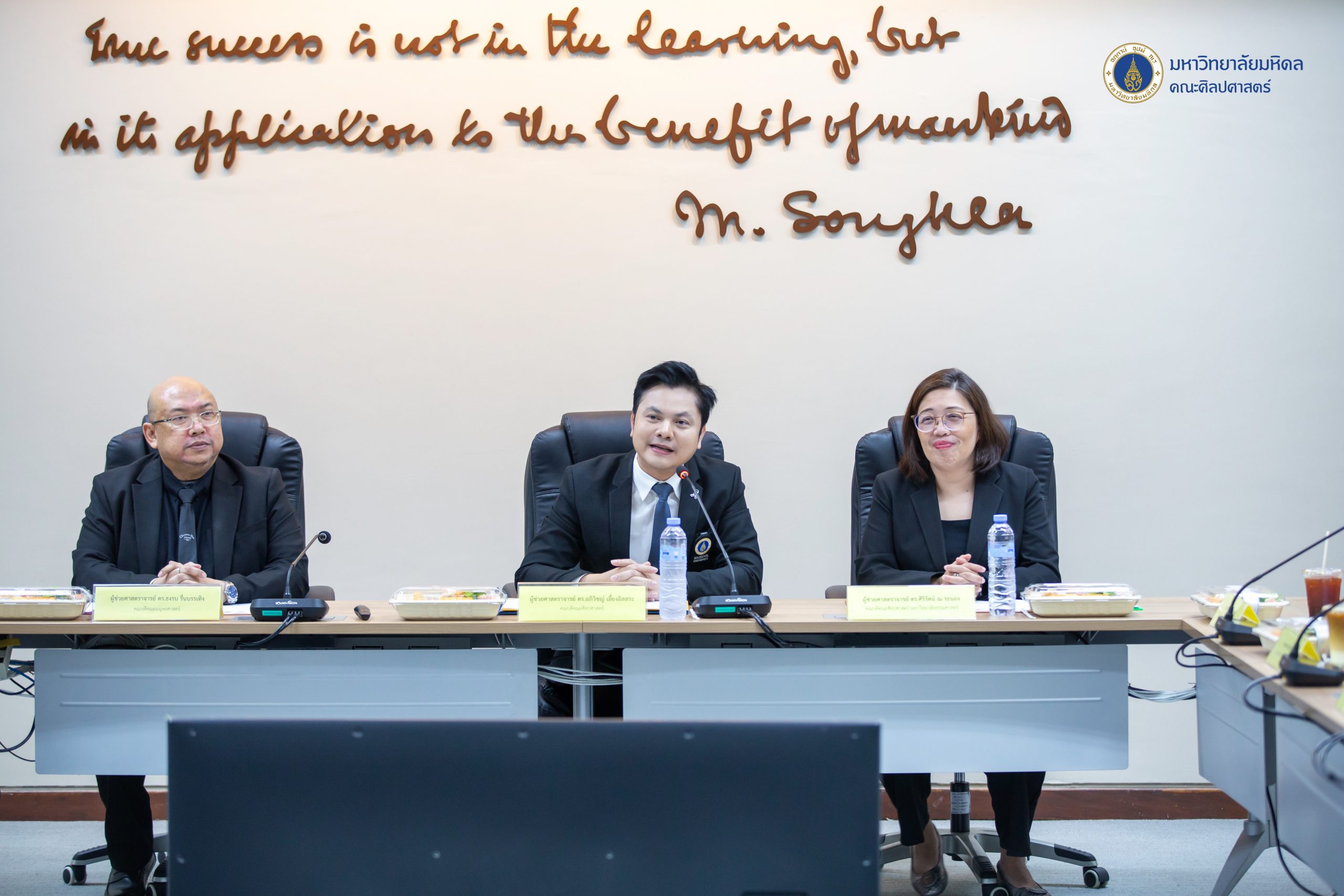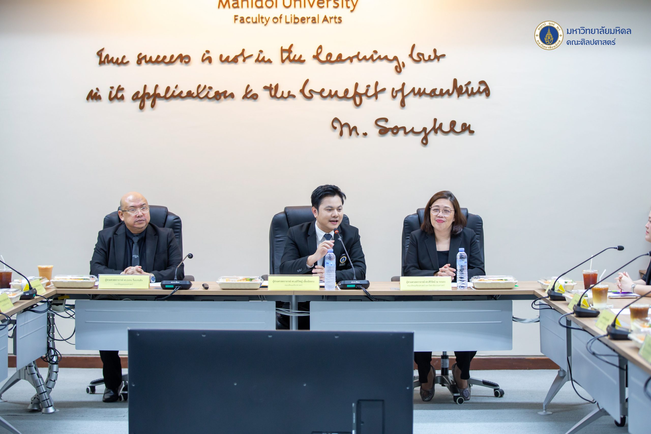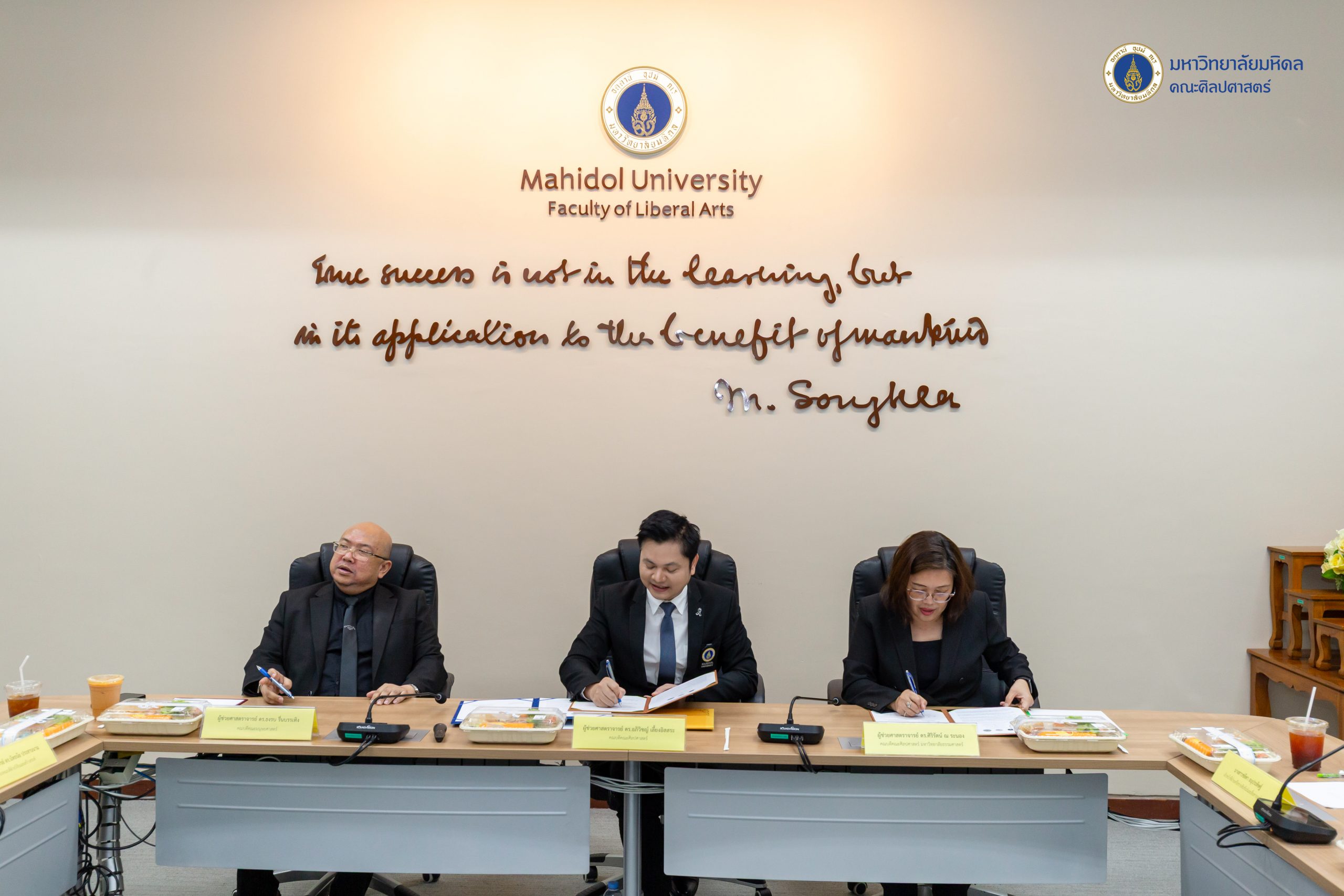 ข่าว ประจำปี 2569 07/01/2026 admin วันที่ 7 มกราคม 2569 คณะศิลปศาสตร์ มหาวิทยาลัยมหิดล นำโดยผู้ช่วยศาสตราจารย์ ดร.อภิวิชญ์ เลี้ยงอิสสระ คณบดี พร้อมด้วยคณะผู้บริหารและบุคลากร ให้การต้อนรับ ผู้ช่วยศาสตราจารย์ ดร.ศิริรัตน์ ณ ระนอง คณบดีคณะศิลปศาสตร์ มหาวิทยาลัยธรรมศาสตร์ ผู้ช่วยศาสตราจารย์ ดร.ธงรบ รื่นบรรเทิง คณบดีคณะมนุษยศาสตร์ มหาวิทยาลัยเกษตรศาสตร์ ศาสตราจารย์ ดร.นัทธนัย ประสานนาม รองคณบดีฝ่ายวิจัยและสร้างสรรค์ ในโอกาสหารือในบันทึกข้อตกลงทางวิชาการ (MoA) ระหว่าง 3 สถาบัน ณ ห้องประชุม 729 ชั้น 7 อาคารสิริวิทยา คณะศิลปศาสตร์ มหาวิทยาลัยมหิดล ศาลายาในการนี้ได้รับเกียรติจากคณบดีจาก 3 สถาบันร่วมลงนามในบันทึกข้อตกลง โดยมีผู้ช่วยศาสตราจารย์ ดร.ณัฐกาญจน์ นาคนวล รองคณบดีฝ่ายวิจัยและวิชาการเพื่อสังคม คณะศิลปศาสตร์ มหาวิทยาลัยมหิดล และศาสตราจารย์ ดร.นัทธนัย ประสานนาม รองคณบดีฝ่ายวิจัยและสร้างสรรค์ คณะมนุษยศาสตร์ มหาวิทยาลัยเกษตรศาสตร์ ร่วมลงนามเป็นสักขีพยาน พร้อมด้วยอาจารย์ ดร.ณัฐนี สัจวจนกุล ผู้ช่วยคณบดีฝ่ายส่งเสริมวิชาการและเครือข่ายสัมพันธ์ คณะศิลปศาสตร์ มหาวิทยาลัยมหิดล และอาจารย์ ดร.วิราพร หงส์เวียงจันทร์ คณะศิลปศาสตร์ มหาวิทยาลัยธรรมศาสตร์ เข้าร่วมพิธี บรรยากาศในการลงนามครั้งนี้เป็นไปด้วยมิตรภาพและความอบอุ่น อันสะท้อนถึงเจตนารมณ์อันดีร่วมกันในการเสริมสร้างและกระชับความสัมพันธ์ระหว่างเครือข่าย ‘ศิลปศาสตร์’ และ ‘มนุษยศาสตร์’ ให้มีความแน่นแฟ้นและยั่งยืนยิ่งขึ้นบันทึกข้อตกลงดังกล่าวมีวัตถุประสงค์เพื่อเพื่อส่งเสริมการพัฒนานักวิจัย อาจารย์ บุคลากร และนักศึกษา ให้มีการแลกเปลี่ยนองค์ความรู้ซึ่งกันและกัน และใช้ทรัพยากรทางวิชาการร่วมกัน ส่งเสริมความร่วมมือในการจัดประชุม สัมมนา และกิจกรรมวิชาการอื่น ๆ ทั้งระดับชาติและนานาชาติ และเพื่อส่งเสริมความร่วมมือในการให้บริการวิชาการแก่สังคมหน่วยงานภาครัฐ เอกชน และชุมชน โดยยึดหลักประโยชน์สาธารณะทั้งนี้ ผู้ช่วยศาสตราจารย์ ดร.อรวี บุนนาค รองประธานหลักสูตรศิลปศาสตรบัณฑิต สาขาวิชาภาษาไทย และคณาจารย์จากหลักสูตรศิลปศาสตรบัณฑิต สาขาวิชาภาษาไทย ร่วมแสดงความยินดีแก่ ศาสตราจารย์ ดร.นัทธนัย ประสานนาม ในโอกาสได้รับพระบรมราชโองการโปรดเกล้าฯ แต่งตั้งให้ดำรงตำแหน่ง “ศาสตราจารย์” สาขาวิชาวรรณคดีไทย