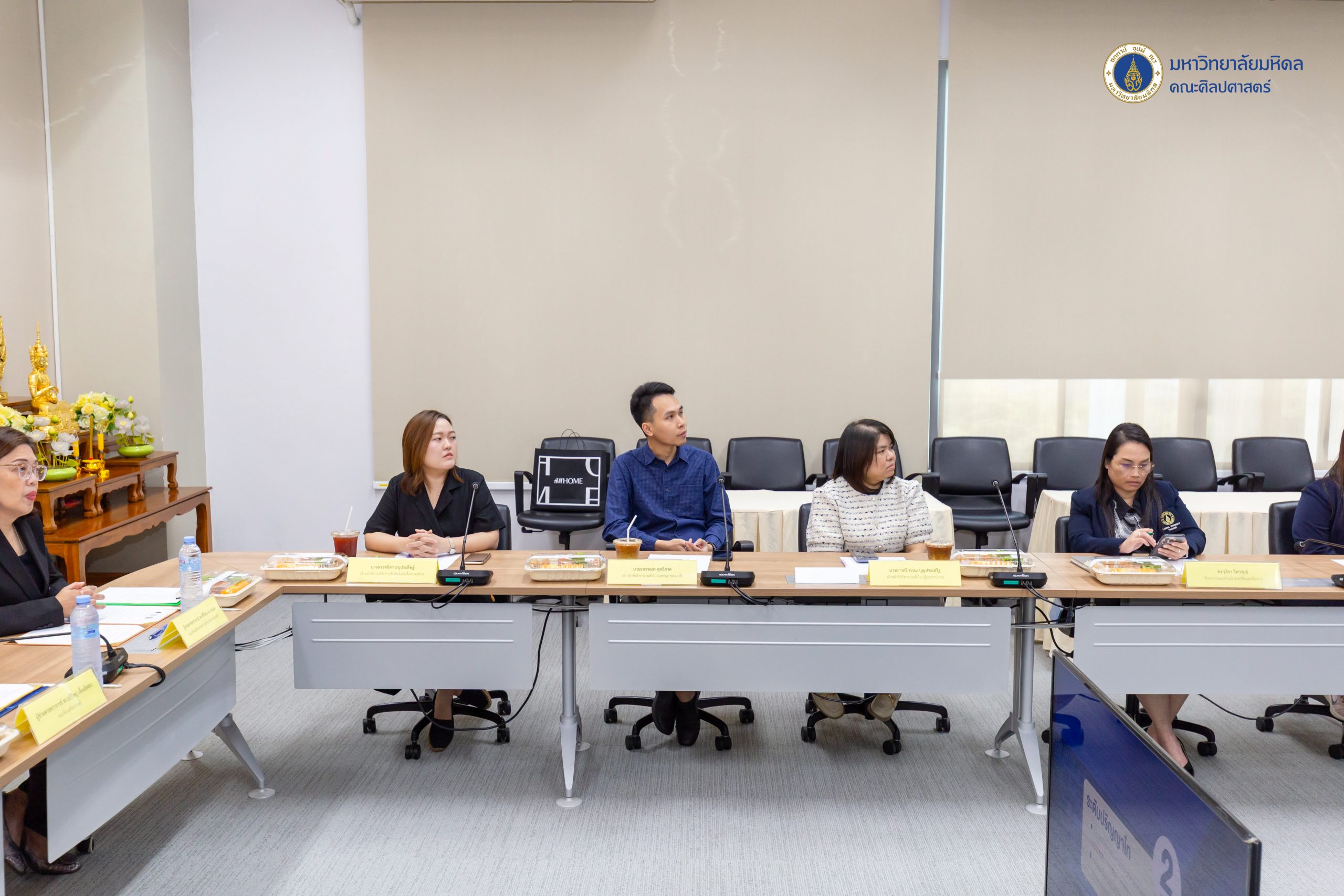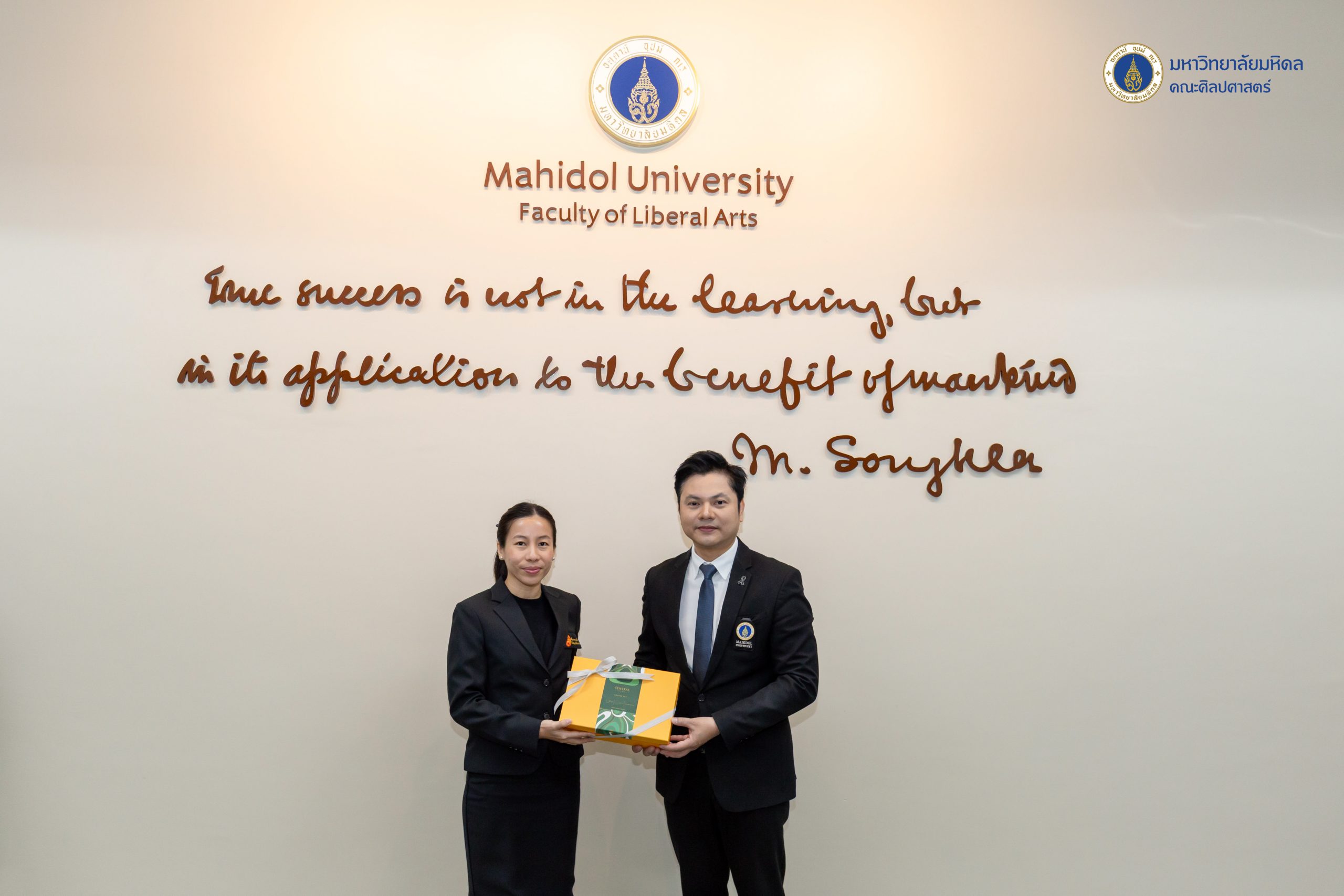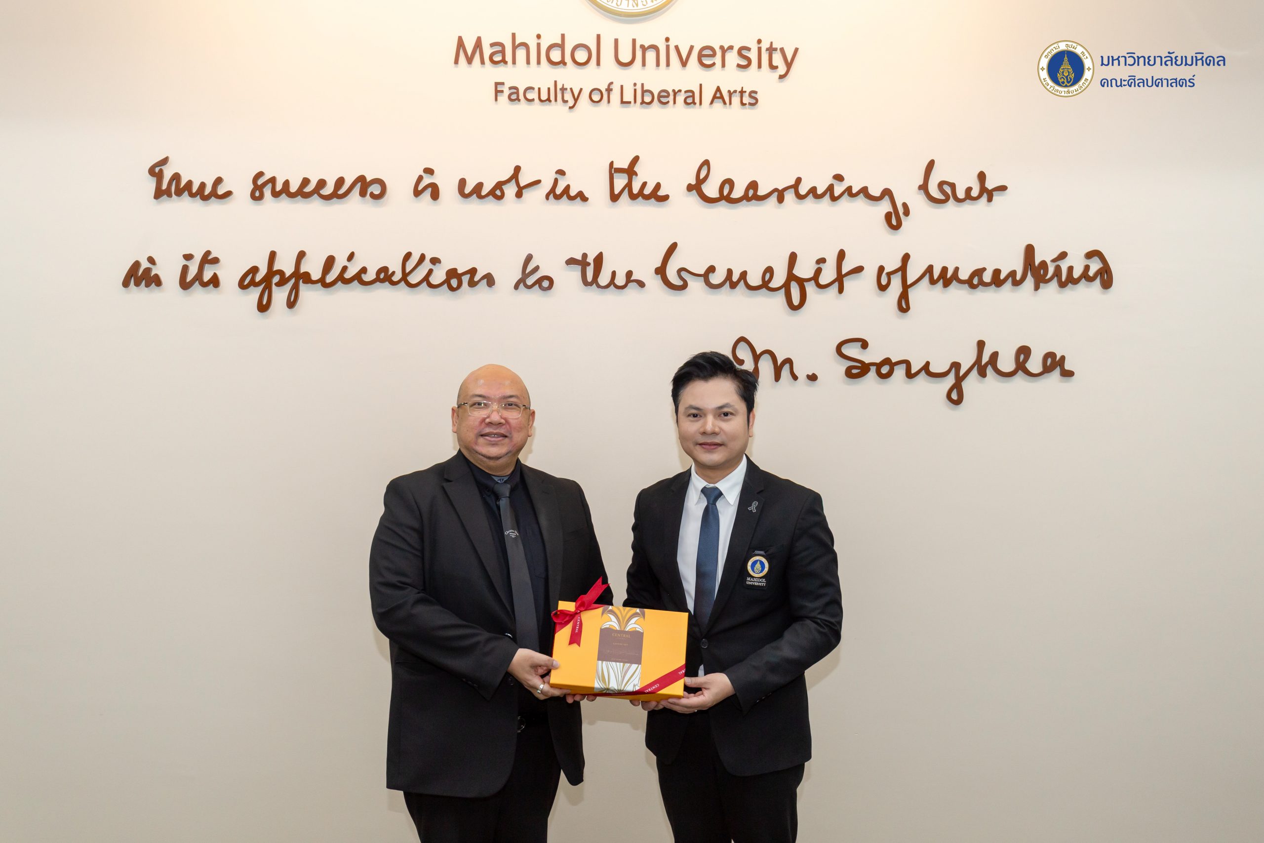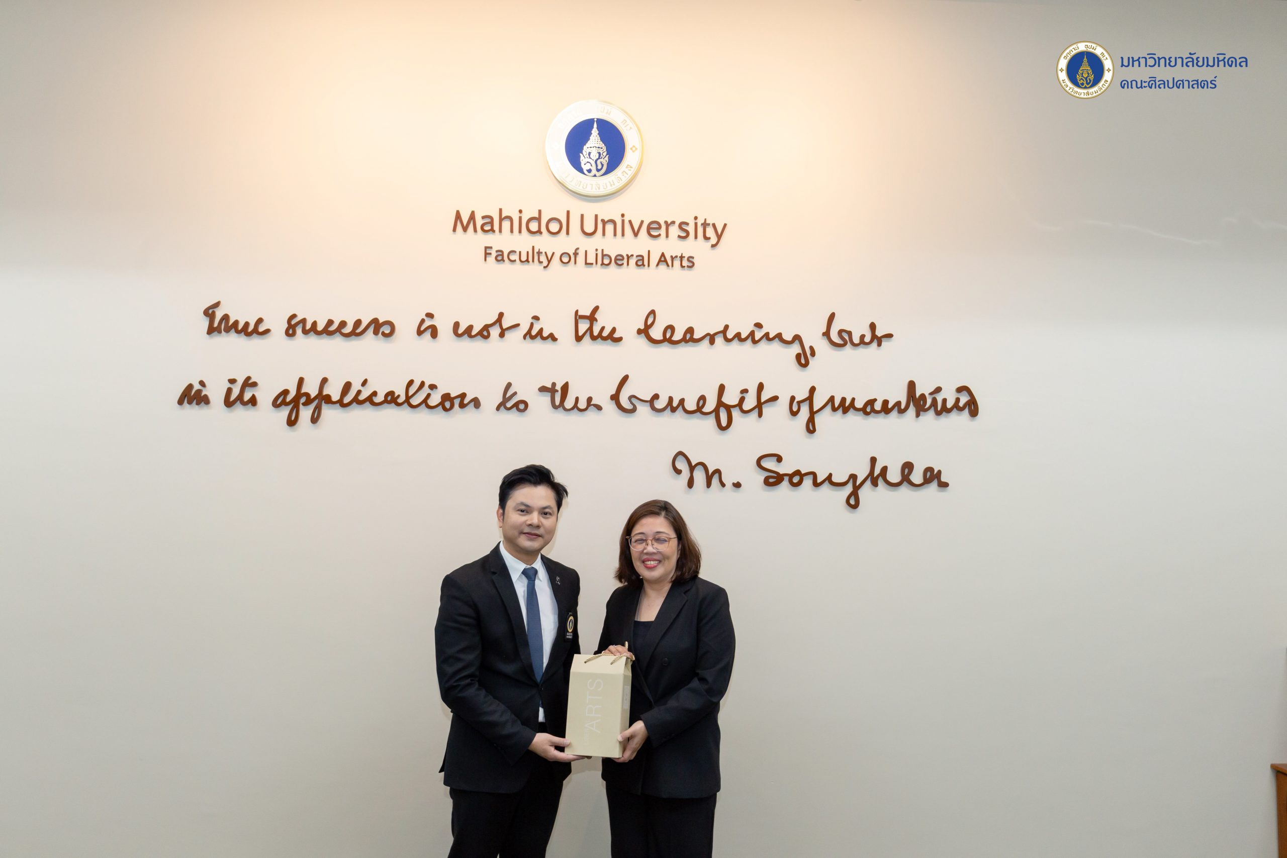 ข่าว ประจำปี 2569 07/01/2026 admin วันที่ 7 มกราคม 2569 คณะศิลปศาสตร์ มหาวิทยาลัยมหิดล นำโดยผู้ช่วยศาสตราจารย์ ดร.อภิวิชญ์ เลี้ยงอิสสระ คณบดี พร้อมด้วยคณะผู้บริหารและบุคลากร ให้การต้อนรับ ผู้ช่วยศาสตราจารย์ ดร.ศิริรัตน์ ณ ระนอง คณบดีคณะศิลปศาสตร์ มหาวิทยาลัยธรรมศาสตร์ ผู้ช่วยศาสตราจารย์ ดร.ธงรบ รื่นบรรเทิง คณบดีคณะมนุษยศาสตร์ มหาวิทยาลัยเกษตรศาสตร์ ศาสตราจารย์ ดร.นัทธนัย ประสานนาม รองคณบดีฝ่ายวิจัยและสร้างสรรค์ ในโอกาสหารือในบันทึกข้อตกลงทางวิชาการ (MoA) ระหว่าง 3 สถาบัน ณ ห้องประชุม 729 ชั้น 7 อาคารสิริวิทยา คณะศิลปศาสตร์ มหาวิทยาลัยมหิดล ศาลายาในการนี้ได้รับเกียรติจากคณบดีจาก 3 สถาบันร่วมลงนามในบันทึกข้อตกลง โดยมีผู้ช่วยศาสตราจารย์ ดร.ณัฐกาญจน์ นาคนวล รองคณบดีฝ่ายวิจัยและวิชาการเพื่อสังคม คณะศิลปศาสตร์ มหาวิทยาลัยมหิดล และศาสตราจารย์ ดร.นัทธนัย ประสานนาม รองคณบดีฝ่ายวิจัยและสร้างสรรค์ คณะมนุษยศาสตร์ มหาวิทยาลัยเกษตรศาสตร์ ร่วมลงนามเป็นสักขีพยาน พร้อมด้วยอาจารย์ ดร.ณัฐนี สัจวจนกุล ผู้ช่วยคณบดีฝ่ายส่งเสริมวิชาการและเครือข่ายสัมพันธ์ คณะศิลปศาสตร์ มหาวิทยาลัยมหิดล และอาจารย์ ดร.วิราพร หงส์เวียงจันทร์ คณะศิลปศาสตร์ มหาวิทยาลัยธรรมศาสตร์ เข้าร่วมพิธี บรรยากาศในการลงนามครั้งนี้เป็นไปด้วยมิตรภาพและความอบอุ่น อันสะท้อนถึงเจตนารมณ์อันดีร่วมกันในการเสริมสร้างและกระชับความสัมพันธ์ระหว่างเครือข่าย ‘ศิลปศาสตร์’ และ ‘มนุษยศาสตร์’ ให้มีความแน่นแฟ้นและยั่งยืนยิ่งขึ้นบันทึกข้อตกลงดังกล่าวมีวัตถุประสงค์เพื่อเพื่อส่งเสริมการพัฒนานักวิจัย อาจารย์ บุคลากร และนักศึกษา ให้มีการแลกเปลี่ยนองค์ความรู้ซึ่งกันและกัน และใช้ทรัพยากรทางวิชาการร่วมกัน ส่งเสริมความร่วมมือในการจัดประชุม สัมมนา และกิจกรรมวิชาการอื่น ๆ ทั้งระดับชาติและนานาชาติ และเพื่อส่งเสริมความร่วมมือในการให้บริการวิชาการแก่สังคมหน่วยงานภาครัฐ เอกชน และชุมชน โดยยึดหลักประโยชน์สาธารณะทั้งนี้ ผู้ช่วยศาสตราจารย์ ดร.อรวี บุนนาค รองประธานหลักสูตรศิลปศาสตรบัณฑิต สาขาวิชาภาษาไทย และคณาจารย์จากหลักสูตรศิลปศาสตรบัณฑิต สาขาวิชาภาษาไทย ร่วมแสดงความยินดีแก่ ศาสตราจารย์ ดร.นัทธนัย ประสานนาม ในโอกาสได้รับพระบรมราชโองการโปรดเกล้าฯ แต่งตั้งให้ดำรงตำแหน่ง “ศาสตราจารย์” สาขาวิชาวรรณคดีไทย