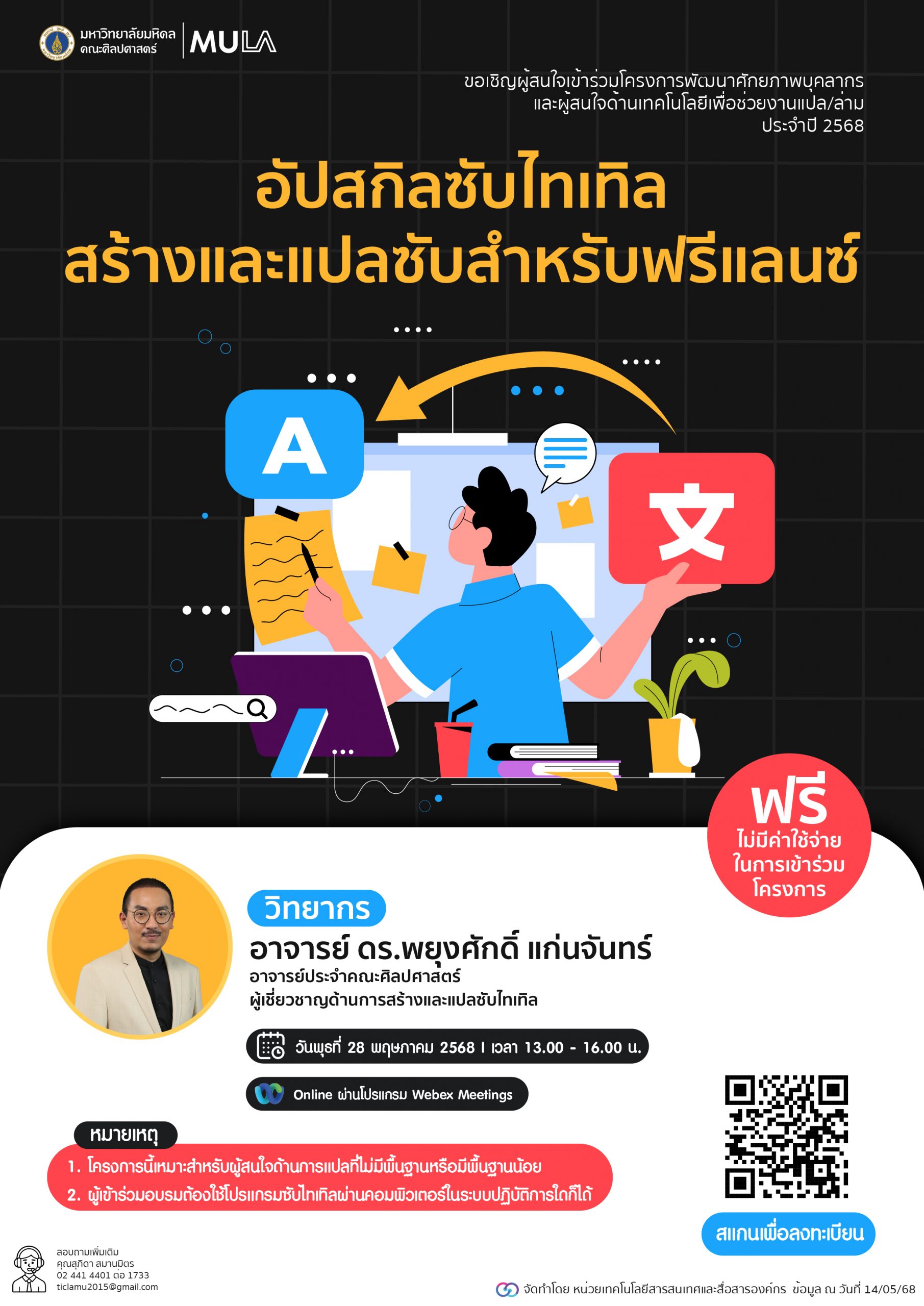 ศูนย์การแปลและการล่าม คณะศิลปศาสตร์ มหาวิทยาลัยมหิดล ขอเชิญผู้สนใจเข้าร่วมโครงการพัฒนาศักยภาพบุคลากรและผู้สนใจด้านการใช้เทคโนโลยีเพื่อช่วยงานแปล/ล่าม ประจำปี 2568