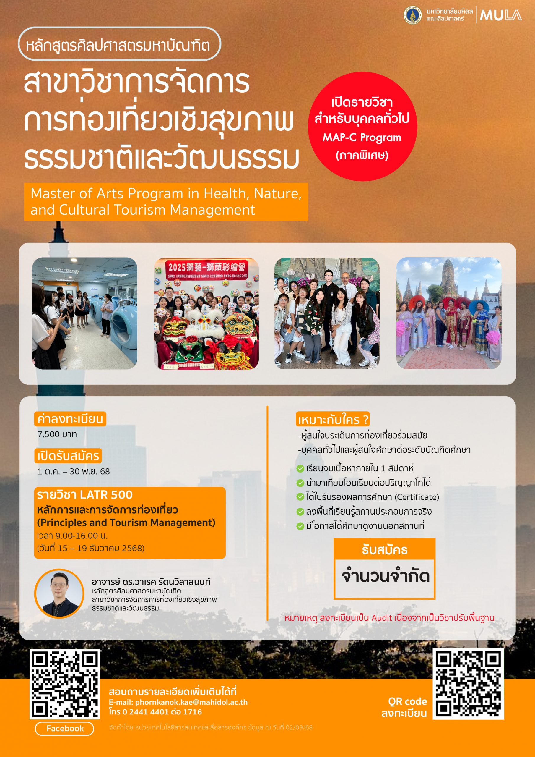 For PR ประชาสัมพันธ์ ประชาสัมพันธ์ 2568 04/09/2025 Kittisak Sookkho โครงการเสวนาด้านการแปลและการล่าม TIC Forum 2568 หัวข้อ “ล่ามศาล: บทบาทและความท้าทายในกระบวนการยุติธรรม” หลักสูตรศิลปศาสตรมหาบัณฑิต สาขาวิชาการจัดการการท่องเที่ยวเชิงสุขภาพ ธรรมชาติและวัฒนธรรม คณะศิลปศาสตร์ มหาวิทยาลัยมหิดล📢เปิดรายวิชาสำหรับบุคคลทั่วไป MAP-C Program (ภาคพิเศษ) ปีการศึกษา 2568 📚วิชา LATR 500 หลักการและการจัดการท่องเที่ยว (Principles and Tourism Management) เวลา 9.00-16.00 น. (วันที่ 15 – 19 ธันวาคม 2568)อาจารย์ ดร.วาเรศ รัตนวิสาลนนท์💰ค่าลงทะเบียน 7,500 บาท 🗓️เปิดรับสมัครตั้งแต่ 1 ต.ค. – 31 พ.ย. 2568💡เหมาะกับผู้สนใจประเด็นการท่องเที่ยวร่วมสมัย💡เหมาะกับบุคคลทั่วไปและผู้สนใจศึกษาต่อระดับบัณฑิตศึกษา✅เรียนจบเนื้อหาภายใน 1 สัปดาห์✅นำมาเทียบโอนเรียนต่อปริญญาโทได้✅ได้ใบรับรองผลการศึกษา (Certificate)✅ลงพื้นที่เรียนรู้สถานประกอบการจริง✅มีโอกาสได้ไปศึกษาดูงานนอกสถานที่ 📌สมัครได้ที่ https://graduate.mahidol.ac.th/MAP-2021/MAP-C.phpสอบถามรายละเอียดเพิ่มเติม✉️ E-mail: phornkanok.kae@mahidol.ac.th 📞โทร 02-441-4401 ต่อ 1716