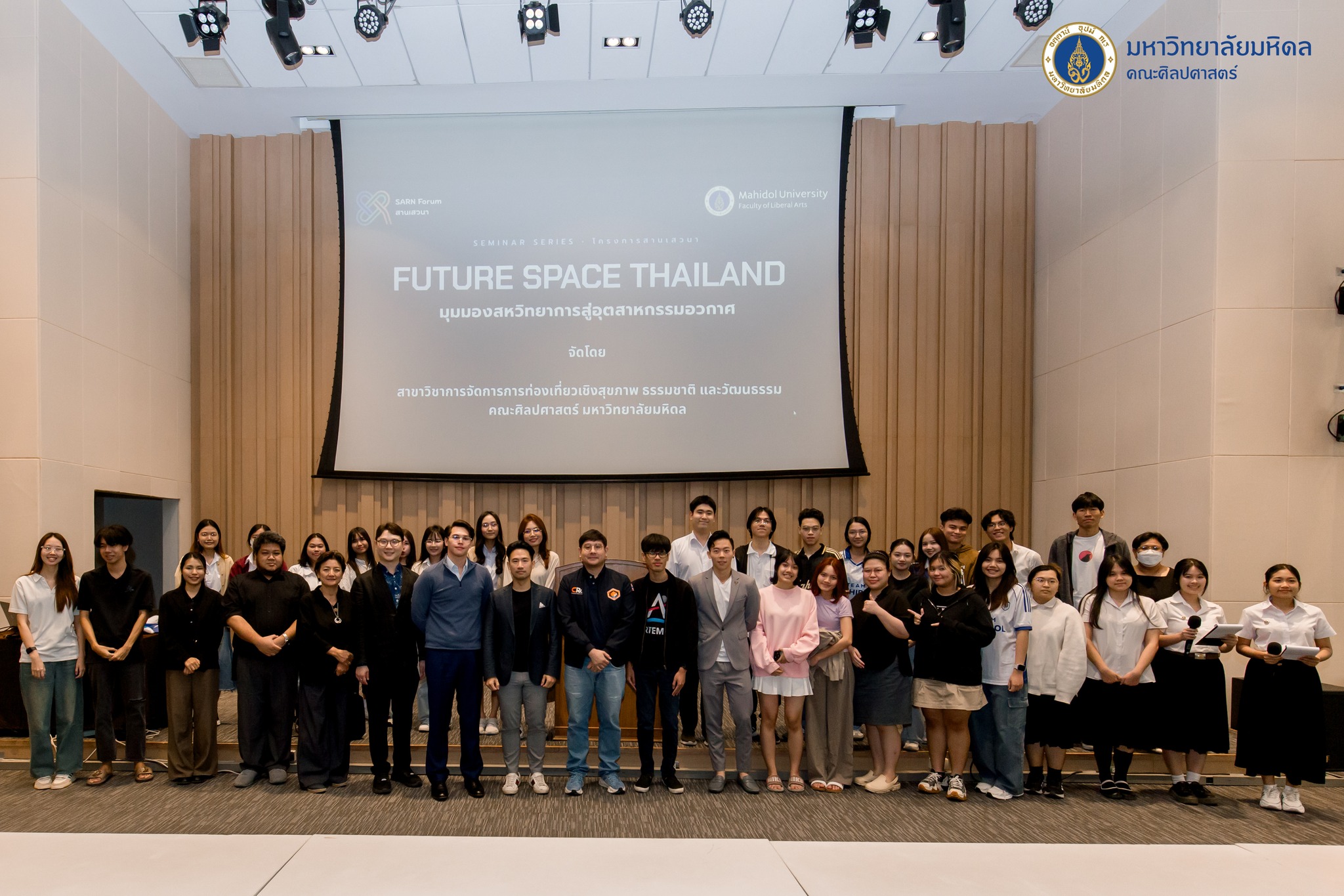 ข่าว ประจำปี 2569 07/01/2026 admin วันที่ 7 มกราคม 2569 หลักสูตรศิลปศาสตรมหาบัณฑิต สาขาวิชาการจัดการการท่องเที่ยวเชิงสุขภาพ ธรรมชาติ และวัฒนธรรม คณะศิลปศาสตร์ มหาวิทยาลัยมหิดล จัดโครงการสานเสวนา Future Space Thailand: มุมมองสหวิทยาการสู่อุตสาหกรรมอวกาศ” โดยได้รับเกียรติจากรองศาสตราจารย์ ดร.นภเรณู สัจจรักษ์ ธีระฐิติ รองอธิการบดีฝ่ายวิเทศสัมพันธ์และสภามหาวิทยาลัย มหาวิทยาลัยมหิดล เป็นประธานกล่าวเปิดโครงการ กล่าวรายงานการจัดโครงการโดยผู้ช่วยศาสตราจารย์ ดร.อภิวิชญ์ เลี้ยงอิสสระ คณบดีคณะศิลปศาสตร์ มหาวิทยาลัยมหิดล ณ ห้องอเนกประสงค์ 322 อาคารศูนย์การเรียนรู้มหิดล มหาวิทยาลัยมหิดล ศาลายาภายในงานมีการเสวนาแบบ Panel Discussion และ Keynote Talk โดยมีผู้เชี่ยวชาญ 5 ท่าน ร่วมให้ความรู้ประกอบด้วยSpace Tourism & Experience — คุณธนัท เตชบวรเกียรติชวนมอง “Space Tourism” ตั้งแต่ภาพฝันสู่ความจริง พร้อมโอกาสของไทยในบริบทการท่องเที่ยวยุคใหม่ Interplanetary Economy — คุณเควิน พสิษฐ์ อันส์ชูทส์เปิดภาพรวมอุตสาหกรรมและศักยภาพของไทยในห่วงโซ่อุปทานด้านอวกาศ รวมถึงการปรับตัวสู่เศรษฐกิจระดับสากล Space Communication — คุณณัฐนนท์ ดวงสูงเนินถอดบทเรียนการสื่อสารวิทยาศาสตร์ให้เข้าใจง่าย พร้อมแนวคิดการสร้างคอมมูนิตี้และโอกาสของสายสื่อ/คอนเทนต์ From Sci‑Fi to Reality — คุณกตัณณ์ ธรรมวิจิตเดชจาก Sci‑Fi สู่โลกจริง: พลังของความคิดสร้างสรรค์ การเล่าเรื่อง และแนวทางการพัฒนา Immersive Content Space Science & Research — ผู้ช่วยศาสตราจารย์ ดร. วเรศ จันทร์เจริญชวนเรียนรู้การทดลองภาวะไร้น้ำหนัก (Zero Gravity) และมุมมองด้านวิทยาศาสตร์อวกาศที่เชื่อมโยงกับสุขภาพและการวิจัยโครงการดังกล่าวมีวัตถุประสงค์เพื่อเปิดมุมมองใหม่ด้านอุตสาหกรรมอวกาศผ่านแนวคิดสหวิทยาการ และสร้างแรงบันดาลใจให้ผู้เข้าร่วมมองเห็นโอกาสของประเทศไทยในการเติบโตสู่อนาคตอวกาศอย่างเป็นรูปธรรม อีกทั้งเป็นการสร้างเครือข่ายความร่วมมือระหว่างสถาบันการศึกษากับผู้เชี่ยวชาญและองค์กรในอุตสาหกรรมอวกาศ โดยได้รับความสนใจจากคณาจารย์ นักศึกษา และผู้สนใจทั่วไป เข้าร่วมรับฟังและแลกเปลี่ยนมุมมองเกี่ยวกับ “อวกาศ” ในมิติที่เชื่อมโยงทั้งการท่องเที่ยว เศรษฐกิจ การสื่อสาร ไปจนถึงวิทยาศาสตร์และการวิจัย
