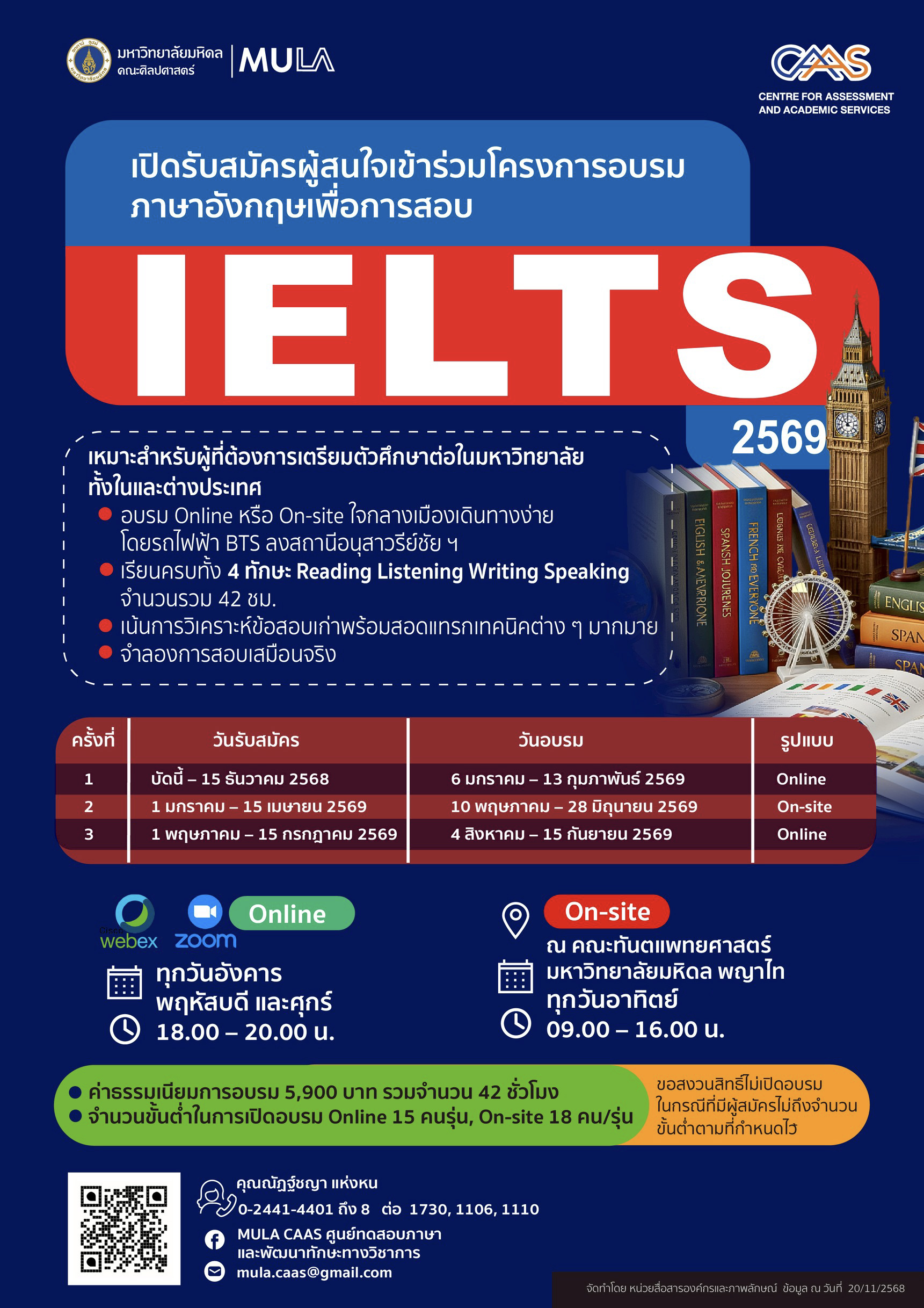 For PR ประชาสัมพันธ์ ประชาสัมพันธ์ 2569 20/11/2025 Kittisak Sookkho โครงการอบรมภาษาอังกฤษเพื่อการสอบ IELTS เหมาะสำหรับผู้ที่ต้องการเตรียมตัวไปศึกษาต่อต่างประเทศและเข้าศึกษาหลักสูตรนานาชาติของมหาวิทยาลัยต่าง ๆ เน้นการวิเคราะห์ข้อสอบเก่าพร้อมสอดแทรกเทคนิคต่าง ๆมากมาย ฝึกสอบกับข้อสอบเสมือนจริงระหว่างเรียนและหลังจบการอบรม โครงการอบรมภาษาอังกฤษเพื่อการสอบ IELTS ครั้งที่ 1/2569 (Online) รับสมัครตั้งแต่บัดนี้ – 20 ธันวาคม 2568ระยะเวลาการอบรม 6 มกราคม – 13 กุมภาพันธ์ 2569ระยะเวลาการอบรม 42 ชั่วโมงทุกวันอังคาร พฤหัสบดี และศุกร์ เวลา 18:00 – 20:00 น.การอบรมออนไลน์ผ่าน Cisco Webex Meetings / Zoom Meetingsค่าลงทะเบียน 5,900 บาทจำนวนขั้นต่ำในการเปิดอบรม 15 คน แต่ไม่เกิน 20 คน/รุ่น สมัครอบรม ตรวจสอบรายชื่อ โครงการอบรมภาษาอังกฤษเพื่อการสอบ IELTS ครั้งที่ 2/2569 (On-site) รับสมัครตั้งแต่บัดนี้ – 15 เมษายน 2569ระยะเวลาการอบรม 10 พฤษภาคม – 28 มิถุนายน 2569ระยะเวลาการอบรม 42 ชั่วโมงทุกวันอาทิตย์ เวลา 09:00 – 16:00 น.การอบรม ณ คณะทันตแพทยศาสตร์ มหาวิทยาลัยมหิดล พญาไทค่าลงทะเบียน 5,900 บาทจำนวนขั้นต่ำในการเปิดอบรม 18 คน แต่ไม่เกิน 20 คน/รุ่น สมัครอบรม ตรวจสอบรายชื่อ สอบถามเพิ่มเติมได้ที่ CAAS ศูนย์ทดสอบภาษาและพัฒนาทักษะทางวิชาการคณะศิลปศาสตร์ มหาวิทยาลัยมหิดลโทร.0-24414401-8 ต่อ 1730, 1110, 1106โทรสาร 0-2441-4140E-mail: mula.caas@gmail.comFacebook: https://www.facebook.com/MULA.CAAS/