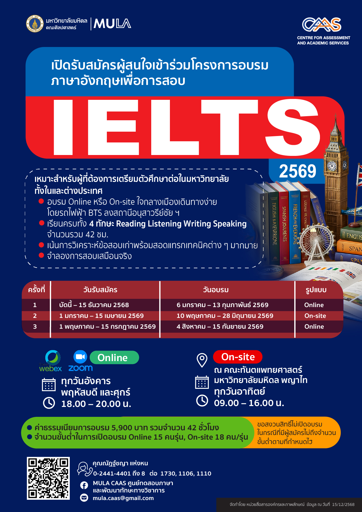 For PR ประชาสัมพันธ์ ประชาสัมพันธ์ 2569 20/11/2025 Kittisak Sookkho โครงการอบรมภาษาอังกฤษเพื่อการสอบ IELTS เหมาะสำหรับผู้ที่ต้องการเตรียมตัวไปศึกษาต่อต่างประเทศและเข้าศึกษาหลักสูตรนานาชาติของมหาวิทยาลัยต่าง ๆ เน้นการวิเคราะห์ข้อสอบเก่าพร้อมสอดแทรกเทคนิคต่าง ๆมากมาย ฝึกสอบกับข้อสอบเสมือนจริงระหว่างเรียนและหลังจบการอบรม โครงการอบรมภาษาอังกฤษเพื่อการสอบ IELTS ครั้งที่ 2/2569 (On-site) รับสมัครตั้งแต่บัดนี้ – 15 เมษายน 2569ระยะเวลาการอบรม 10 พฤษภาคม – 28 มิถุนายน 2569ระยะเวลาการอบรม 42 ชั่วโมงทุกวันอาทิตย์ เวลา 09:00 – 16:00 น.การอบรม ณ คณะทันตแพทยศาสตร์ มหาวิทยาลัยมหิดล พญาไทค่าลงทะเบียน 5,900 บาทจำนวนขั้นต่ำในการเปิดอบรม 18 คน แต่ไม่เกิน 20 คน/รุ่น สมัครอบรม ตรวจสอบรายชื่อ โครงการอบรมภาษาอังกฤษเพื่อการสอบ IELTS ครั้งที่ 3/2569 (Online) รับสมัครตั้งแต่บัดนี้ – 15 กรกฎาคม 2569ระยะเวลาการอบรม 4 สิงหาคม – 25 กันยายน 2569ระยะเวลาการอบรม 42 ชั่วโมงทุกวันอังคาร พฤหัสบดี และศุกร์ เวลา 18:00 – 20:00 น.การอบรมออนไลน์ผ่าน Cisco Webex Meetings / Zoom Meetingsค่าลงทะเบียน 5,900 บาทจำนวนขั้นต่ำในการเปิดอบรม 15 คน แต่ไม่เกิน 20 คน/รุ่น สมัครอบรม ตรวจสอบรายชื่อ สอบถามเพิ่มเติมได้ที่ CAAS ศูนย์ทดสอบภาษาและพัฒนาทักษะทางวิชาการคณะศิลปศาสตร์ มหาวิทยาลัยมหิดลโทร.0-24414401-8 ต่อ 1730, 1110, 1106โทรสาร 0-2441-4140E-mail: mula.caas@gmail.comFacebook: https://www.facebook.com/MULA.CAAS/