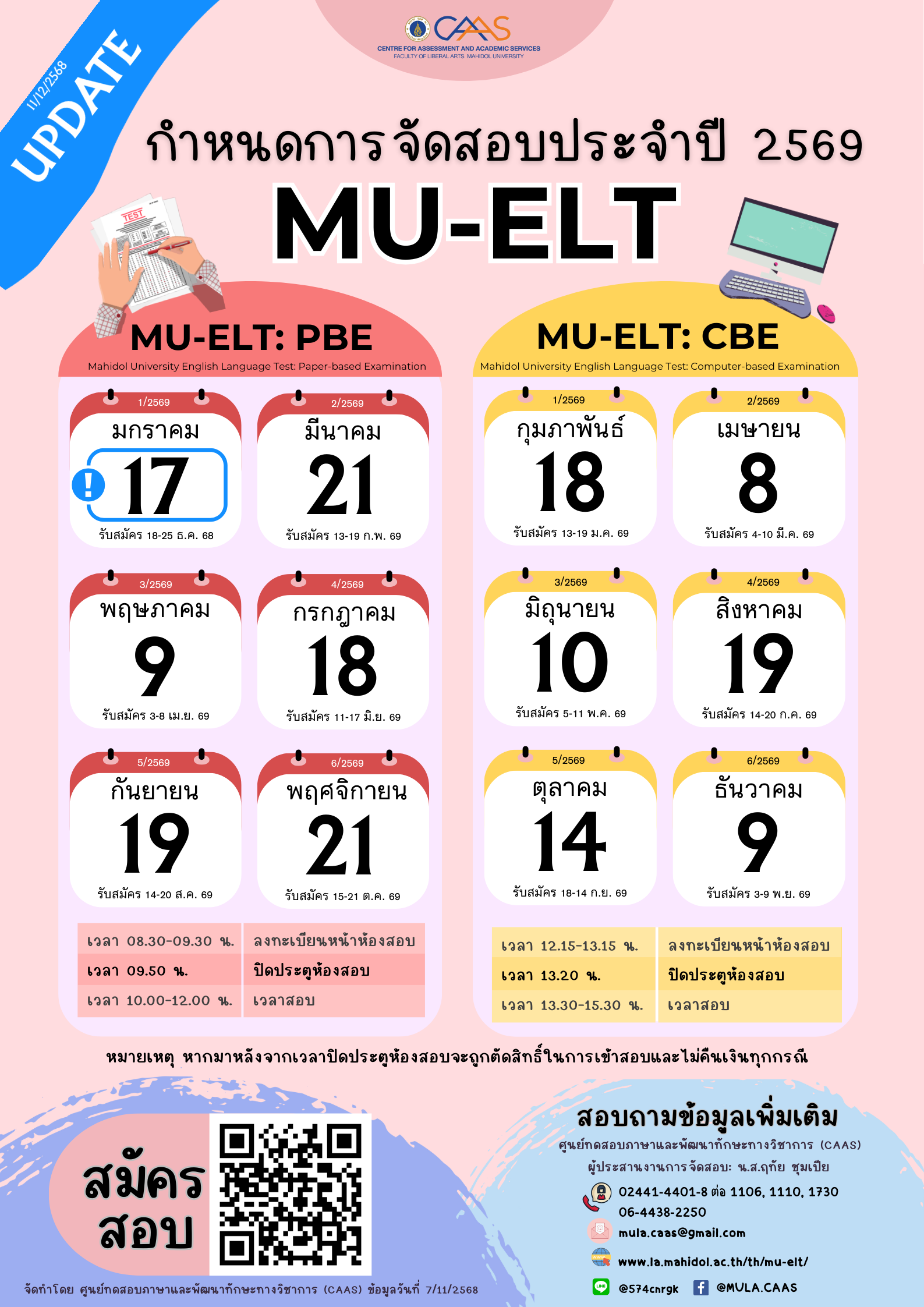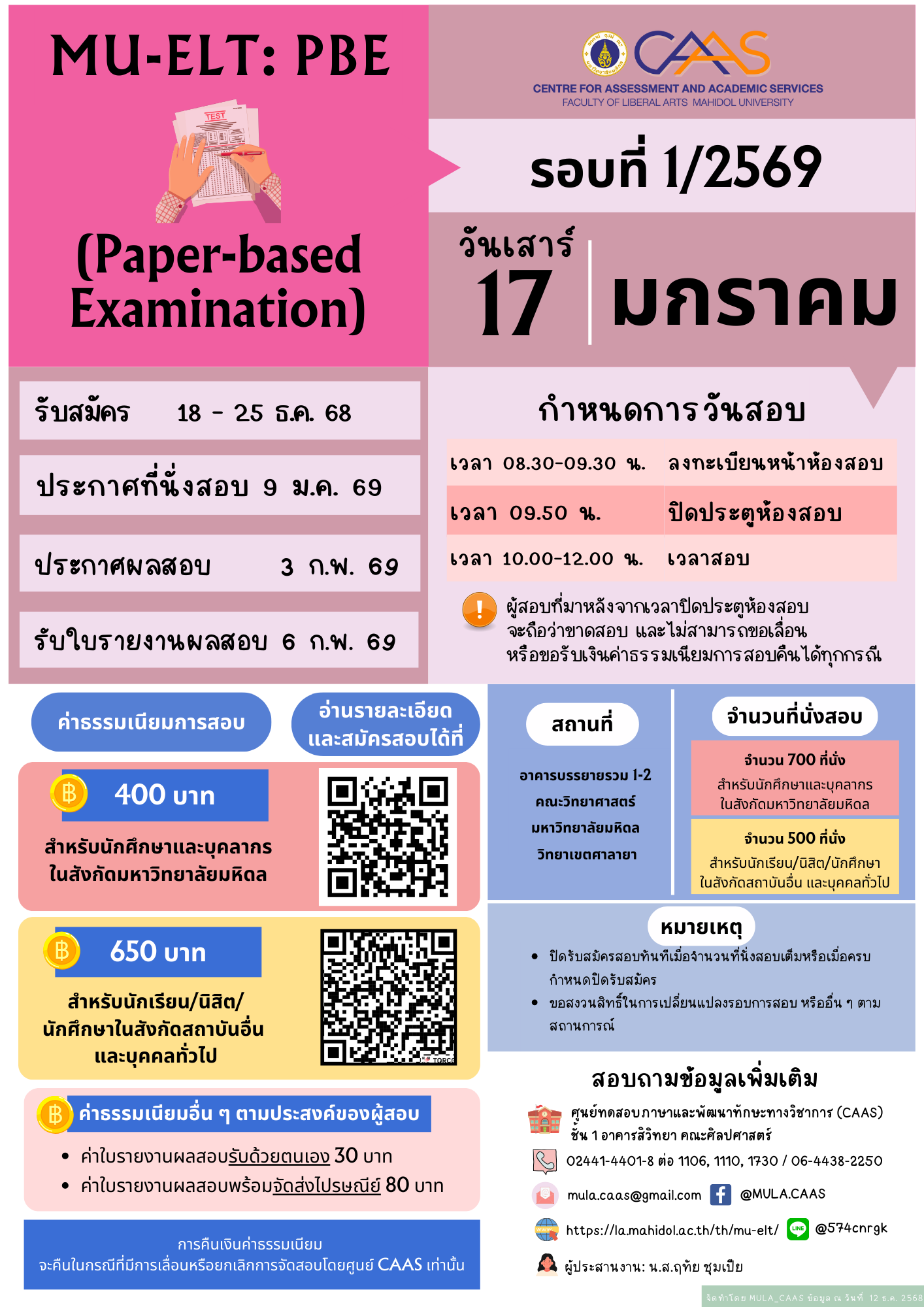 For any special assistance such as the visually-impaired, please contact the staff before the MU-ELT registration at CAAS: Tel. 02-4414401-8 ext. 1106, 1110, 1730 (operating hours)