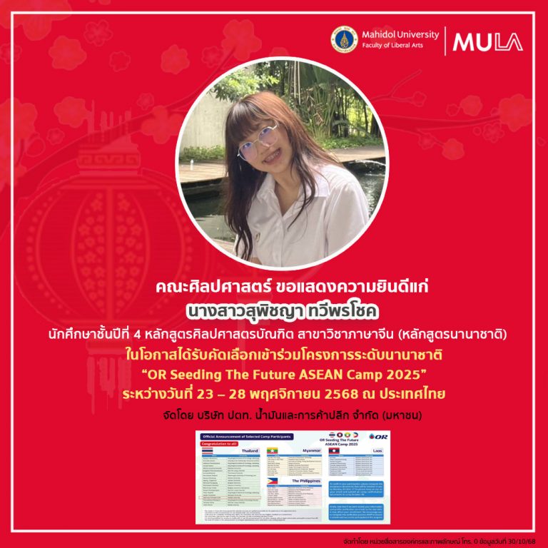 คณะศิลปศาสตร์ ขอแสดงความยินดีแก่ นางสาวสุพิชญา ทวีพรโชค นักศึกษาชั้นปีที่ 4 หลักสูตรศิลปศาสตรบัณฑิต สาขาวิชาภาษาจีน (หลักสูตรนานาชาติ) ในโอกาสที่ได้รับคัดเลือกเข้าร่วมโครงการระดับนานาชาติ “OR Seeding The Future ASEAN Camp 2025” ระหว่างวันที่ 23 – 28 พฤศจิกายน 2568 ณ ประเทศไทย