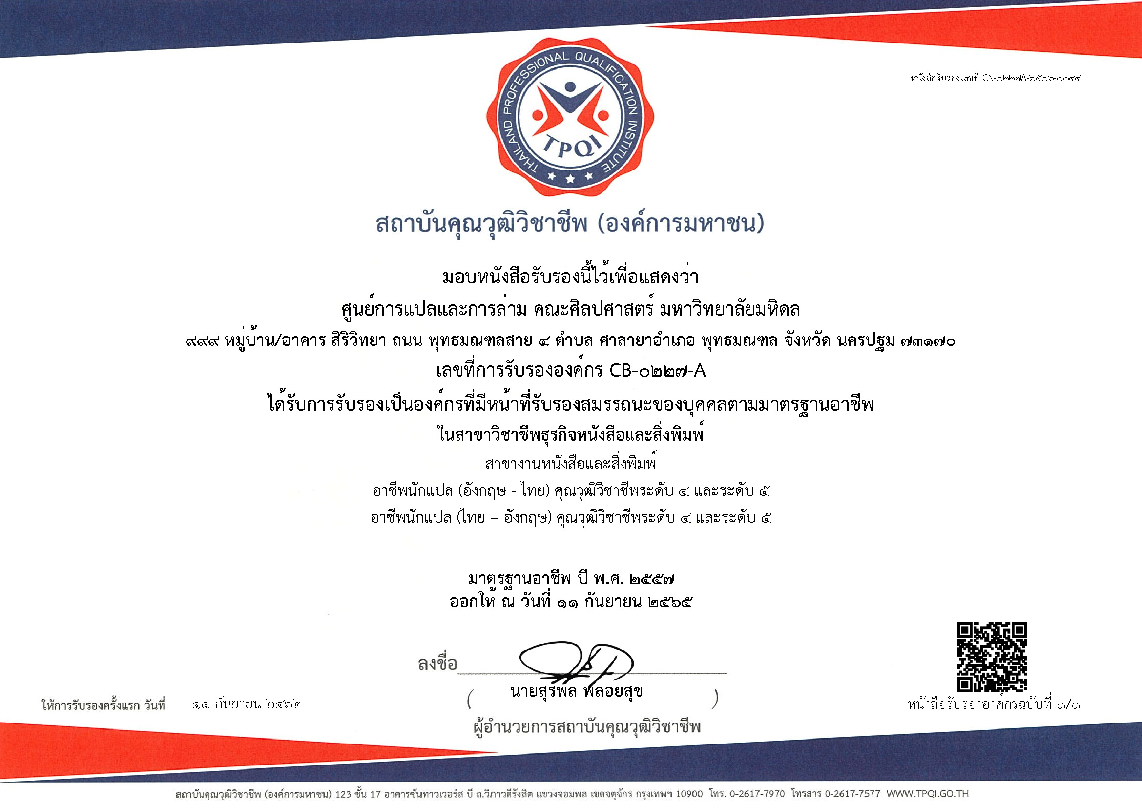 บริการการล่ามบริการการล่ามและประสานงานการประชุม ภาษาไทย อังกฤษ จีน ญี่ปุ่น อาหรับ ล่ามติดตามตัว (Escort Interpreting) ทำหน้าที่ในการติดตามบุคคล คณะบุคคล หรือกลุ่มบุคคลขนาดเล็กเพื่อการเยี่ยมชมสถานที่ ดูงาน การจัดประชุม การสัมภาษณ์หรือทำหน้าที่ประสานงานในด้านต่างๆระหว่างกลุ่มบุคคล ล่ามต่อเนื่อง (Consecutive Interpreting) ทำหน้าที่แปลหรือสื่อสารหลังจากผู้พูดภาษาต้นทางพูดจบลง ประมาณ 3-10 ประโยคและมีจังหวะหยุดให้ทางล่ามต่อเนื่องได้แปลสื่อสารออกมาให้ผู้ฟังได้เข้าใจ เพื่องานฝึกอบรมสัมมนา งานแถลงข่าว งานประชาสัมพันธ์ ประวัติของศูนย์ ใบรับรอง ปี 2565-2568 ปี 2562-2565 สถานศึกษาปลอดภัย บริการการแปลและการล่าม มาตรฐานอาชีพนักแปล บริการการแปล บริการการล่าม วารสารการแปลและการล่าม การอบรม โครงการ TICTec โครงการ TICForum โครงการอบรมการแปล การจัดสอบนักแปล ที่อยู่ของศูนย์ฯ ศูนย์การแปลและการล่าม คณะศิลปศาสตร์ มหาวิทยาลัยมหิดลTranslation and Interpretation Center, Faculty of Liberal, Arts, Mahidol University (TICLA)999 ถนนพุทธมณฑล สาย 4 ตำบลศาลายา อำเภอพุทธมณฑล จังหวัดนครปฐม 73170Website: www.la.mahidol.ac.th/th/ticlaEmail: ticlamu2015@gmail.com ติดต่อ ประธานศูนย์ฯ อาจารย์ ดร.ญาณัชพิมพ์ ภาสวรเวทย์ Tel: 02-441-4401-8 เจ้าหน้าที่ประจำศูนย์ คุณสุภิดา สมานมิตรTel: 02-441-4401-8 ext.1733