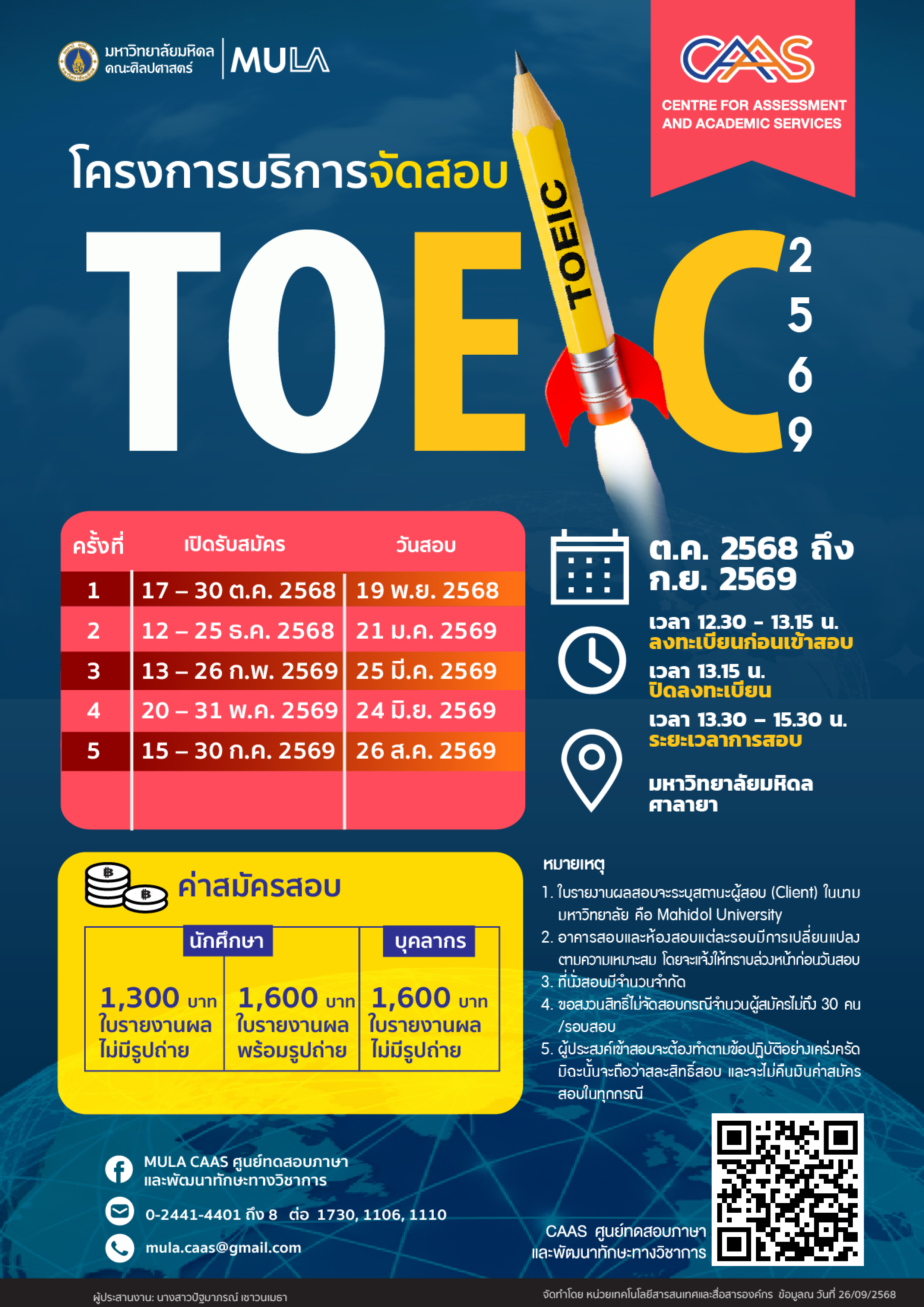 For PR ประชาสัมพันธ์ ประชาสัมพันธ์ 2568 08/10/2025 Kittisak Sookkho การบริการจัดสอบ TOEIC เป็นบริการการจัดสอบ TOEIC ขึ้นภายในมหาวิทยาลัยมหิดล สำหรับนักศึกษาและบุคลากรมหาวิทยาลัยมหิดล ที่มีความประสงค์จะสอบวัดความรู้เพื่อนำผลคะแนนไปประกอบการสมัครงาน เพื่อปรับคุณวุฒิ หรือเพื่อทดสอบความสามารถทางภาษาอังกฤษของตนเอง โครงการบริการจัดสอบ TOEIC ครั้งที่ 1/2569 (19 พฤษจิกายน 2568) เปิดรับสมัครระหว่างวันที่ 17 – 30 ตุลาคม 2568 สมัคร ตรวจสอบรายชื่อ ระเบียบและข้อปฏิบัติในการสอบ เงื่อนไขการสมัครสอบ TOEICผู้สมัครต้องเป็นนักศึกษา หรือบุคลากร มหาวิทยาลัยมหิดลเท่านั้นอัตราค่าสมัครสอบ นักศึกษา บุคลากร 1,300 1,600 1,600 ใบรายงานผลแบบไม่มีรูปถ่าย ใบรายงานผลพร้อมรูปถ่าย ใบรายงานผลแบบไม่มีรูปถ่าย หมายเหตุ แต่งกายด้วยชุดสุภาพสำหรับถ่ายรูปหลักฐานที่ผู้สอบต้องแสดงหน้าห้องสอบบัตรประจำตัวประชาชนตัวจริง/หนังสือเดินทาง (Passport) ตัวจริงที่ยังไม่หมดอายุ/ใบขับขี่บัตรประจำตัวนักศึกษา/บัตรพนักงาน/ข้าราชการที่ยังไม่หมดอายุหมายเหตุ : คณะจัดเตรียมอุปกรณ์เครื่องเขียนทุกอย่าง ผู้สอบไม่ต้องนำมา ข้อปฏิบัติในการเข้าสอบ ผู้สอบทุกท่านต้องรายงานตัวหน้าห้องสอบก่อนเวลาสอบอย่างน้อย 30 นาที เพื่อทำการลงทะเบียนเมื่อเข้าห้องสอบผู้สอบต้องนั่งตามที่นั่งซึ่งเจ้าหน้าที่ดำเนินการจัดสอบกำหนดให้เท่านั้นไม่อนุญาตให้นำอุปกรณ์สื่อสาร รวมถึงอุปกรณ์อิเล็กทรอนิกส์ทุกชนิดเข้าห้องสอบ เช่น โทรศัพท์มือถือ handy drive กุญแจรถ เครื่องเล่น MP3 เป็นต้น ไม่ว่าในกรณีใด ๆ ทั้งสิ้น แม้ว่าปิดเครื่องแล้วก็ตามไม่อนุญาตให้นำสิ่งของที่นำติดตัวมาด้วย เช่น กระเป๋าถือ เอกสารต่าง ๆ รวมถึงทรัพย์สินมีค่าใด ๆ เข้าห้องสอบไม่ว่าในกรณีใด ๆ ทั้งสิ้นไม่อนุญาตให้ผู้สอบออกจากห้องสอบจนกว่าเจ้าหน้าที่ดำเนินการจัดสอบจะแจ้งว่ากระบวนการจัดสอบเสร็จสิ้นทั้งนี้ผู้สอบที่ไม่ปฏิบัติตามระเบียบการและข้อปฏิบัติในการจัดสอบ ทางคณะฯ ขอสงวนสิทธิ์ไม่อนุญาตให้ผู้สอบท่านนั้นทำการสอบ และ/หรือไม่ออกผลคะแนนตามแต่กรณี สอบถามเพิ่มเติมได้ที่ CAAS ศูนย์ทดสอบภาษาและพัฒนาทักษะทางวิชาการคณะศิลปศาสตร์ มหาวิทยาลัยมหิดลโทร.0-24414401-8 ต่อ 1730, 1110, 1106โทรสาร 0-2441-4140E-mail: mula.caas@gmail.comFacebook: https://www.facebook.com/MULA.CAAS/